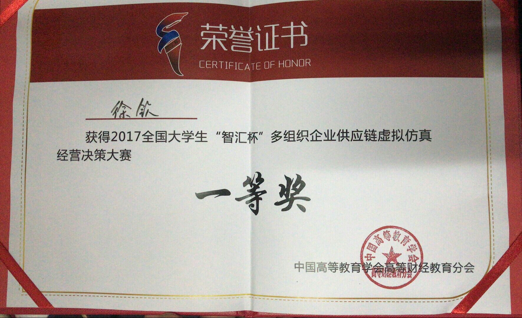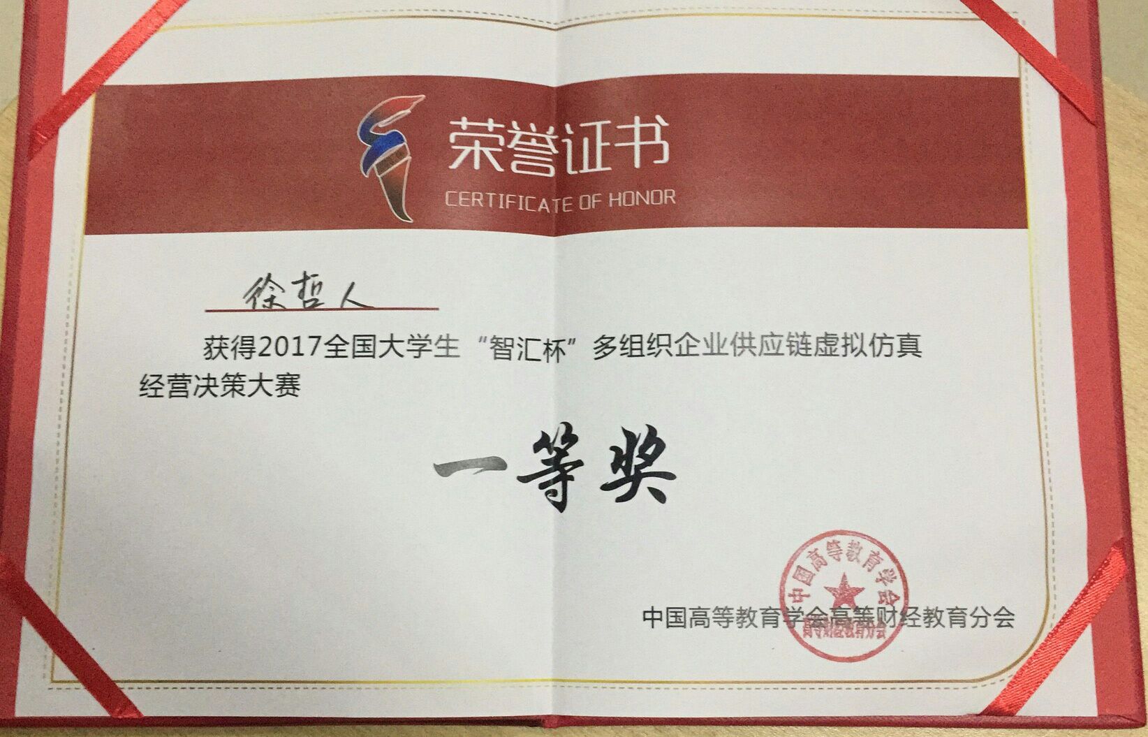 15金融1班忻瑜萱、 15金融3班徐哲人、14金融3班徐钦、会计学院林煜南等4位同学组成的代表队,在经济与管理实验中心李晶老师的指导下,以总排名第三的成绩荣获总决赛一等奖。