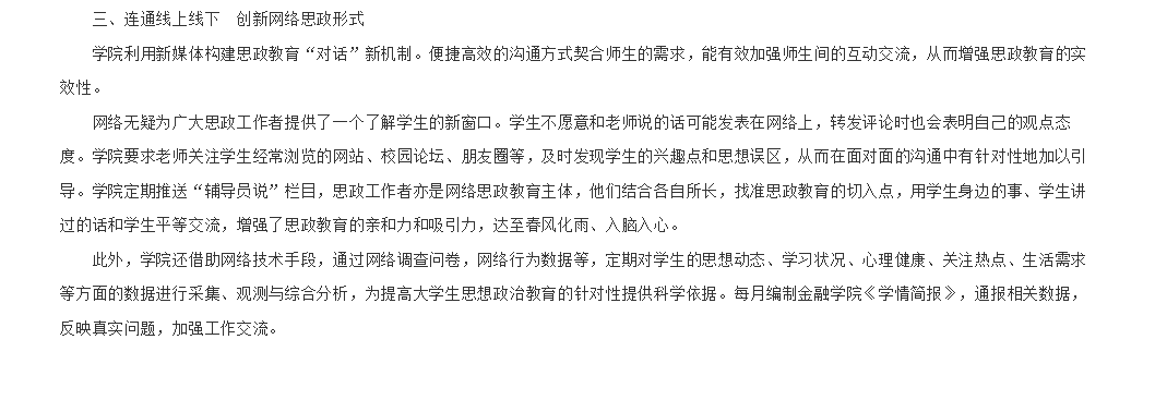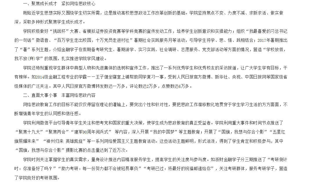 党委深入学习贯彻习近平总书记在全国高校思想政治工作会议上的重要讲话精神,坚持立德树人中心环节,运用网络新媒体使思想政治教育工作“活”起来,切实增强思政教育的时代感和吸引力,受到师生的一致好评。