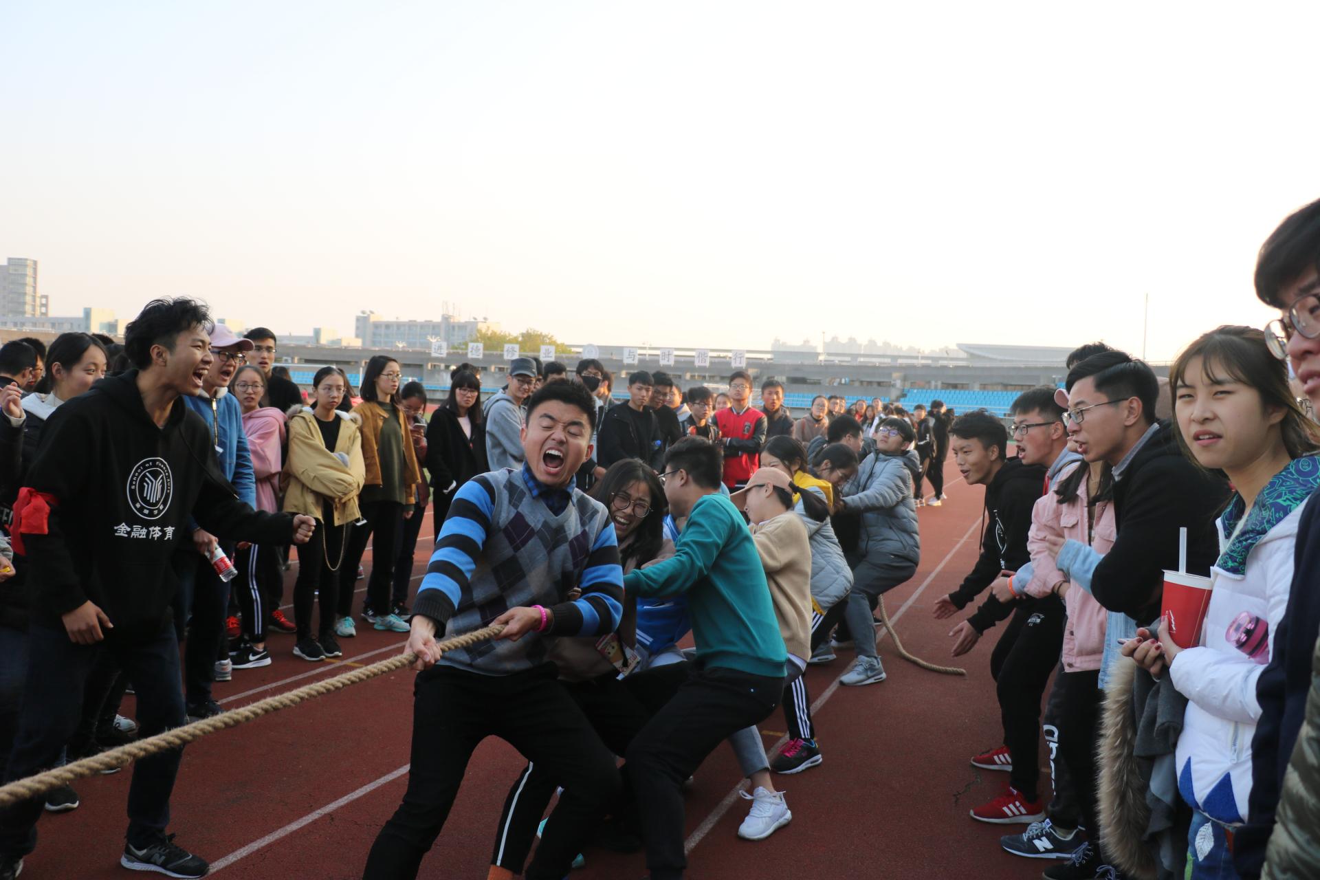最后一个比赛是十人拔河。拔河两两分组,两组之中获胜的再进行比拼。长绳两端是一个个咬牙用力的运动员,每个人的双手都紧紧抓住粗糙的绳子,将身体都尽量倾向地面,坚毅的精神已经让他们忽略了摩擦的疼痛感,只想为班级奋力拼搏。在经过三四轮力量的较量后,拔河比赛的冠军是16金融工程1班,季亚军分别是15中英金融2班和17中英金融2班。