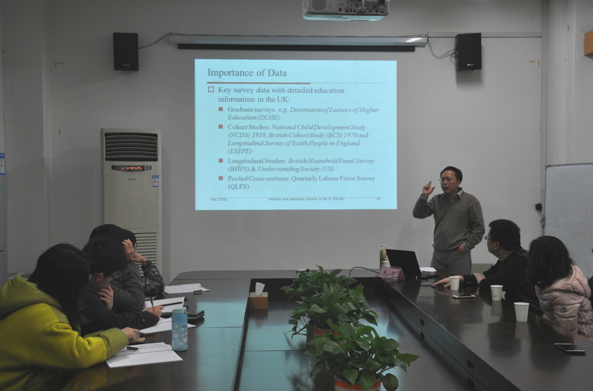 朱宇教授是“家庭与经济问题杂志”(Journal of Family and Economic Issues)的编委,苏格兰经济学会理事。主要研究领域为教育经济学,家庭经济学,劳动经济学,发展经济学,应用计量经济学。朱宇教授通过使用由英国教育部(DFE)开发的新的纵向教育成果(LEO)管理数据集,在劳动力市场上跟踪大量不同学校、专业的学生,从毕业生之间的背景和先前成就的差异出发,将高等教育学生和毕业生的收入与29岁时的类似个人进行比较,得出结论:不同院校的学位和学科都会对毕业生的收入产生了重要影响。最后,在场的师生踊跃提出问题,朱宇教授也进行了全面且细致的回答,整个讲座的气氛十分热烈。