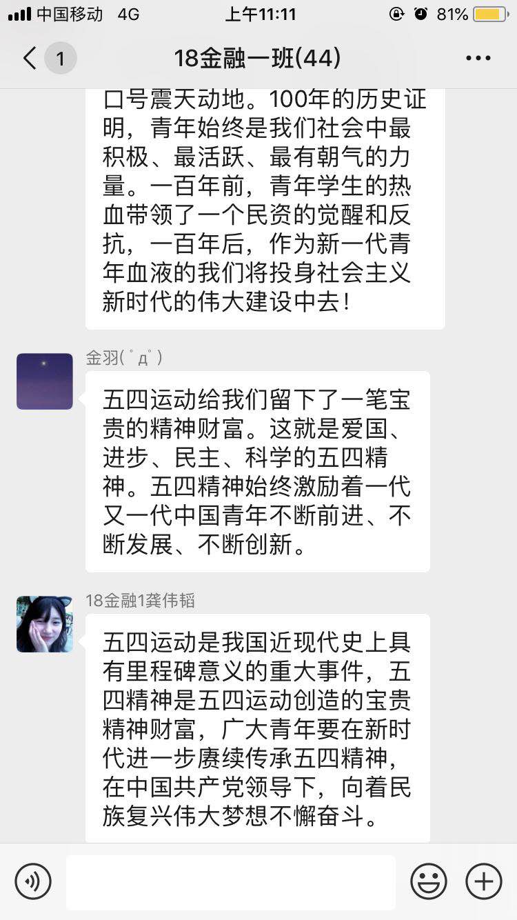 18金融三班团支书李鑫楠说,作为新时代的青年,我们要坚持中国共产党的领导,听党话,跟党走,把自己的小我融合进祖国和人民的大我中。要和广大人民一起为实现中华民族伟大复兴的目标而奋斗。新时代青年要积极发扬五四精神,高举爱国主义的旗帜,居安思危,艰苦奋斗,敢于创新,同时也要树立远大的抱负,担当时代的责任,立志成为德智体美劳全面发展的社会主义接班人。