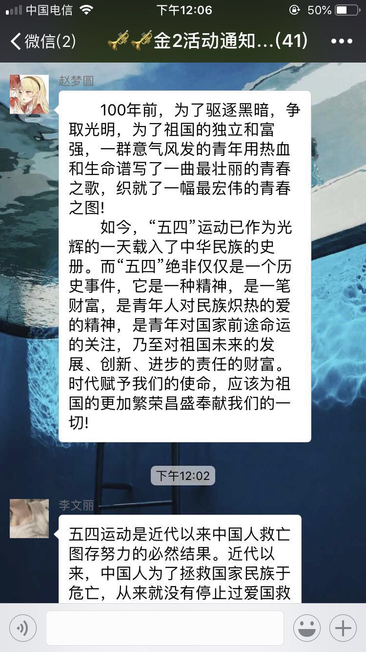 17信用管理班团支书王思晨说,虽然五四运动已经过去了整整一百周年,“但爱国、进步、民主、科学”的“五四精神”应被每一个时代的青年人所牢记,也值得每一个时代的青年人学习。作为新时代的新青年,我们也应该担负起时代的责任。 作为新时代的学生干部我们应当珍惜锻炼能力的机会,在学习上带头勤奋学习学好专业知识,培养科学精神,模范遵守校纪校规和学术规范,在学生工作中我们要努力为服务同学作为主要目的,认真倾听广大同学诉求,积极畅通校园沟通协调渠道,实心实意帮助同学解决困难。
