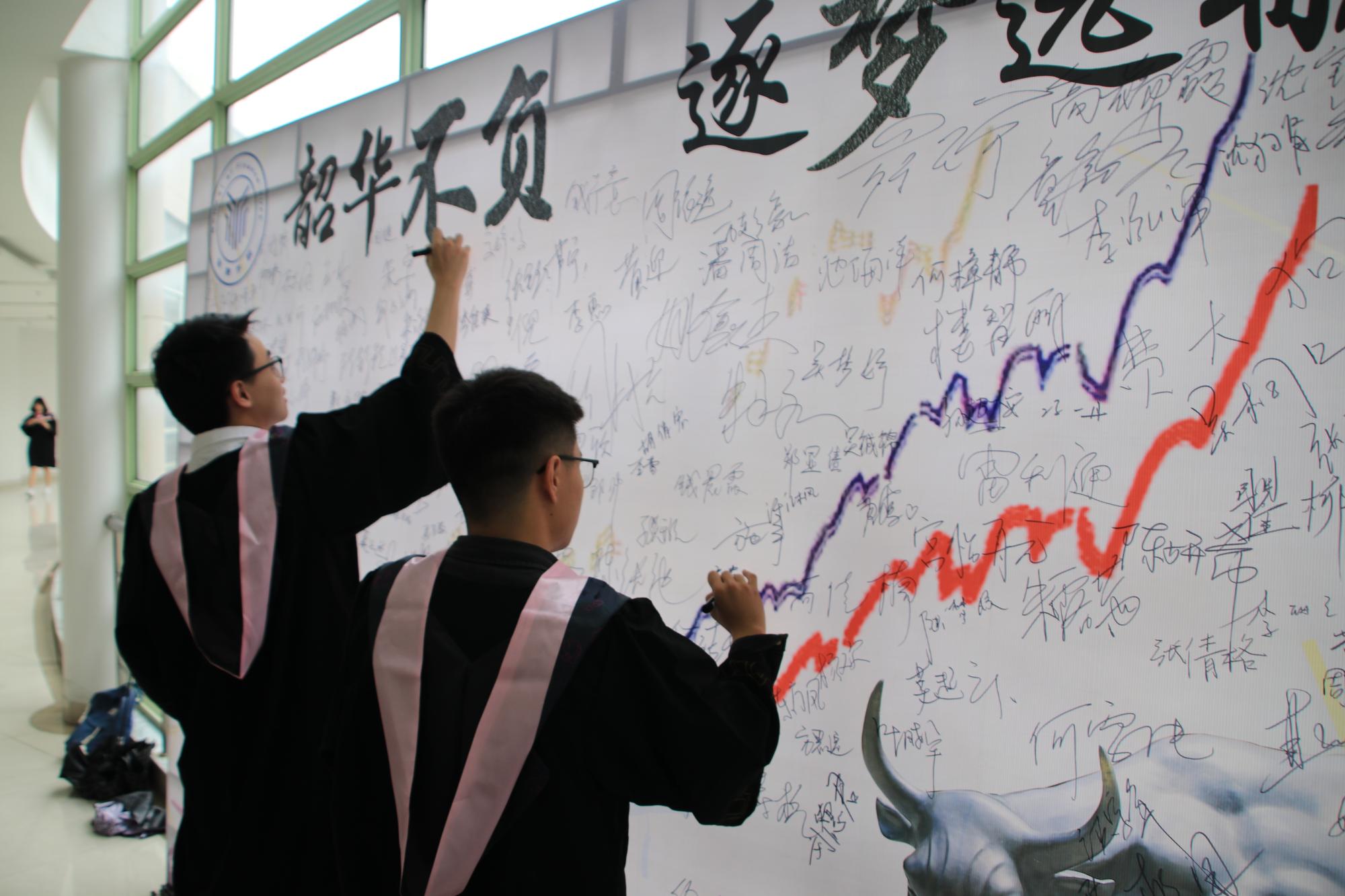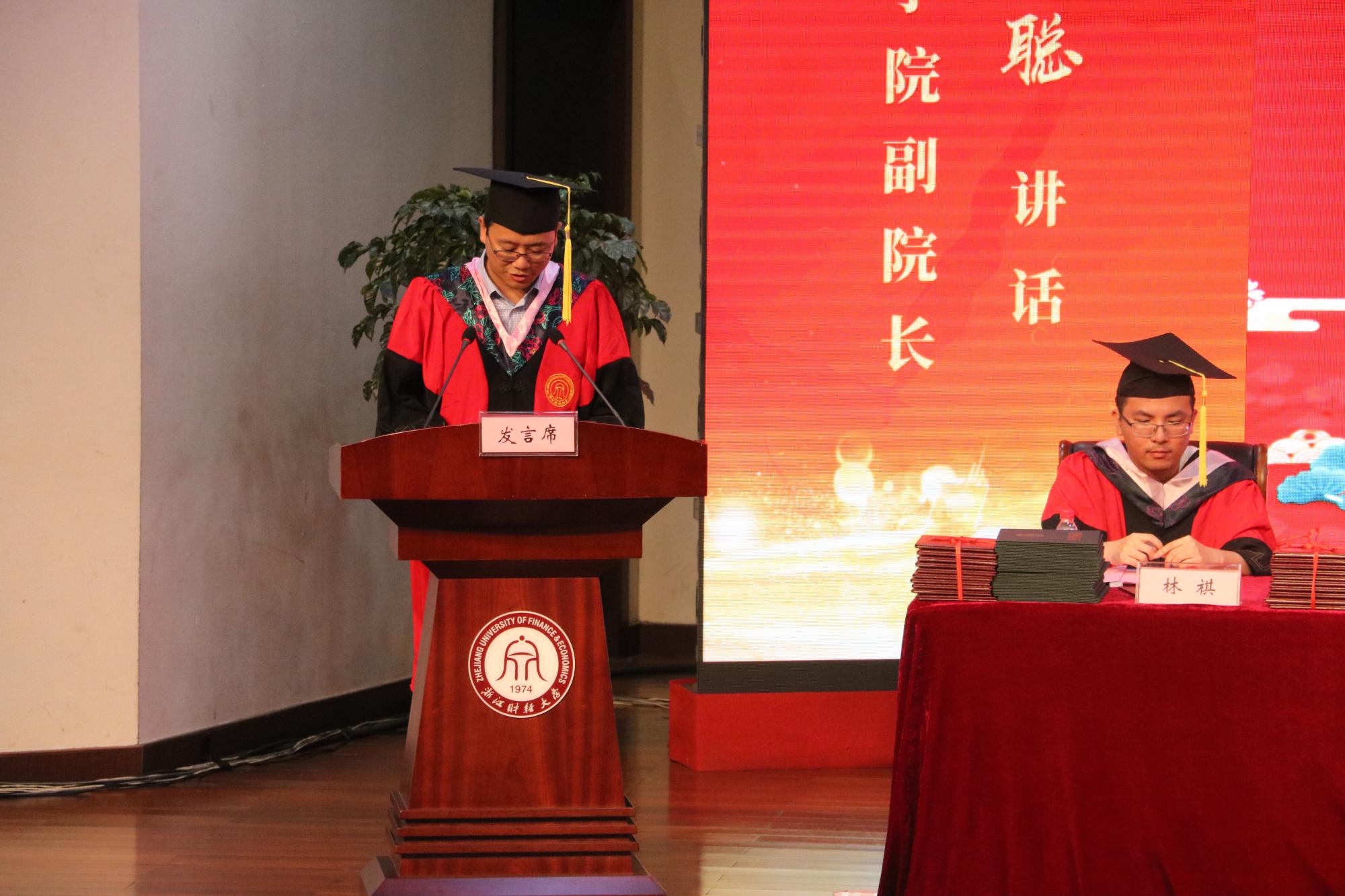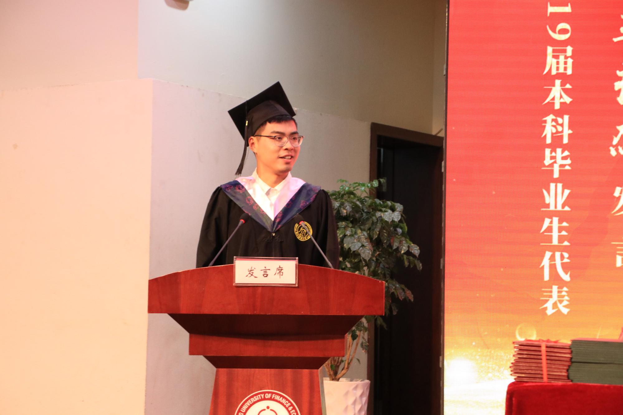 毕业生代表15中英金融2班王书杰和大家一起回忆了大学四年的点点滴滴,他说,“此去经年,不管我们身处何地,相信浙财情谊将永远把我们紧密地联系在一起,充盈自己前进的行囊。”