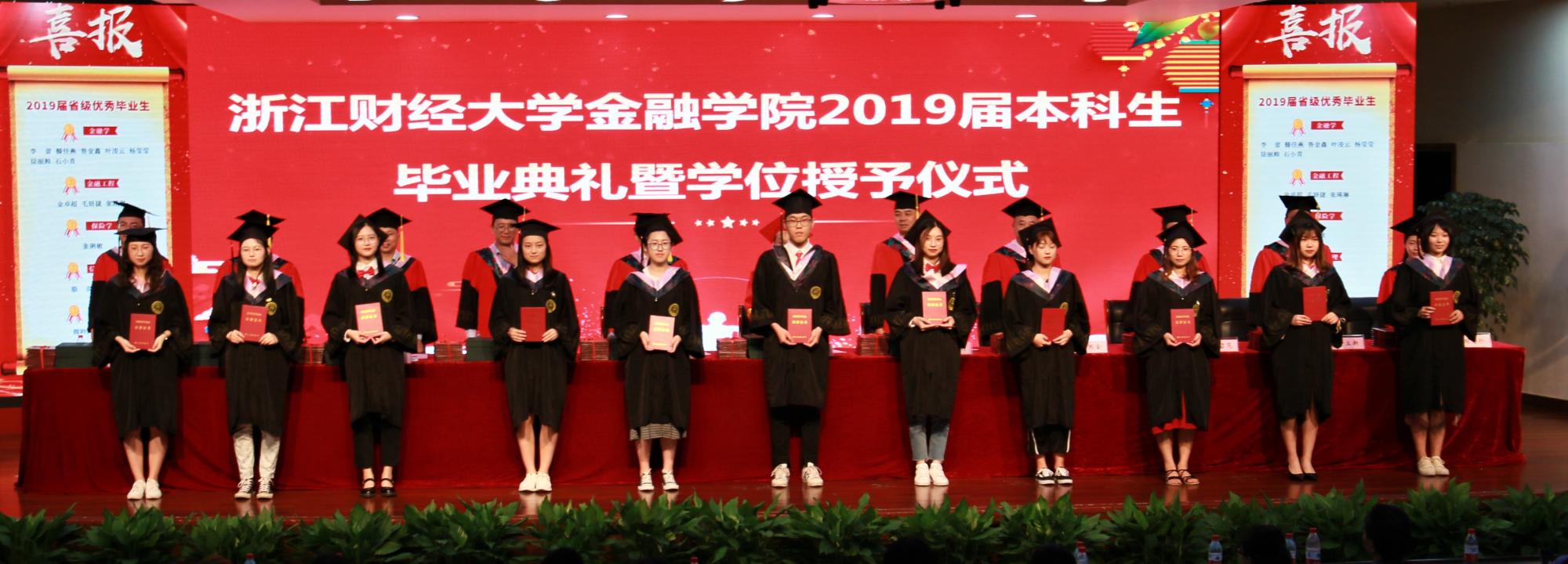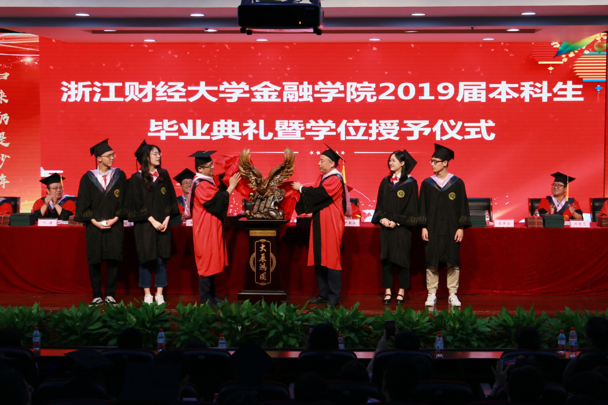 接着,省优秀毕业生、“明栋基金”获奖者上台领奖。朝气蓬勃的毕业生代表们向学院汇报自己大学四年的感悟与收获,并互赠礼物。在典礼的最后,2019届金融学子依次上台,完成拨穗礼,接过学位证书,并于恩师们合影留念。