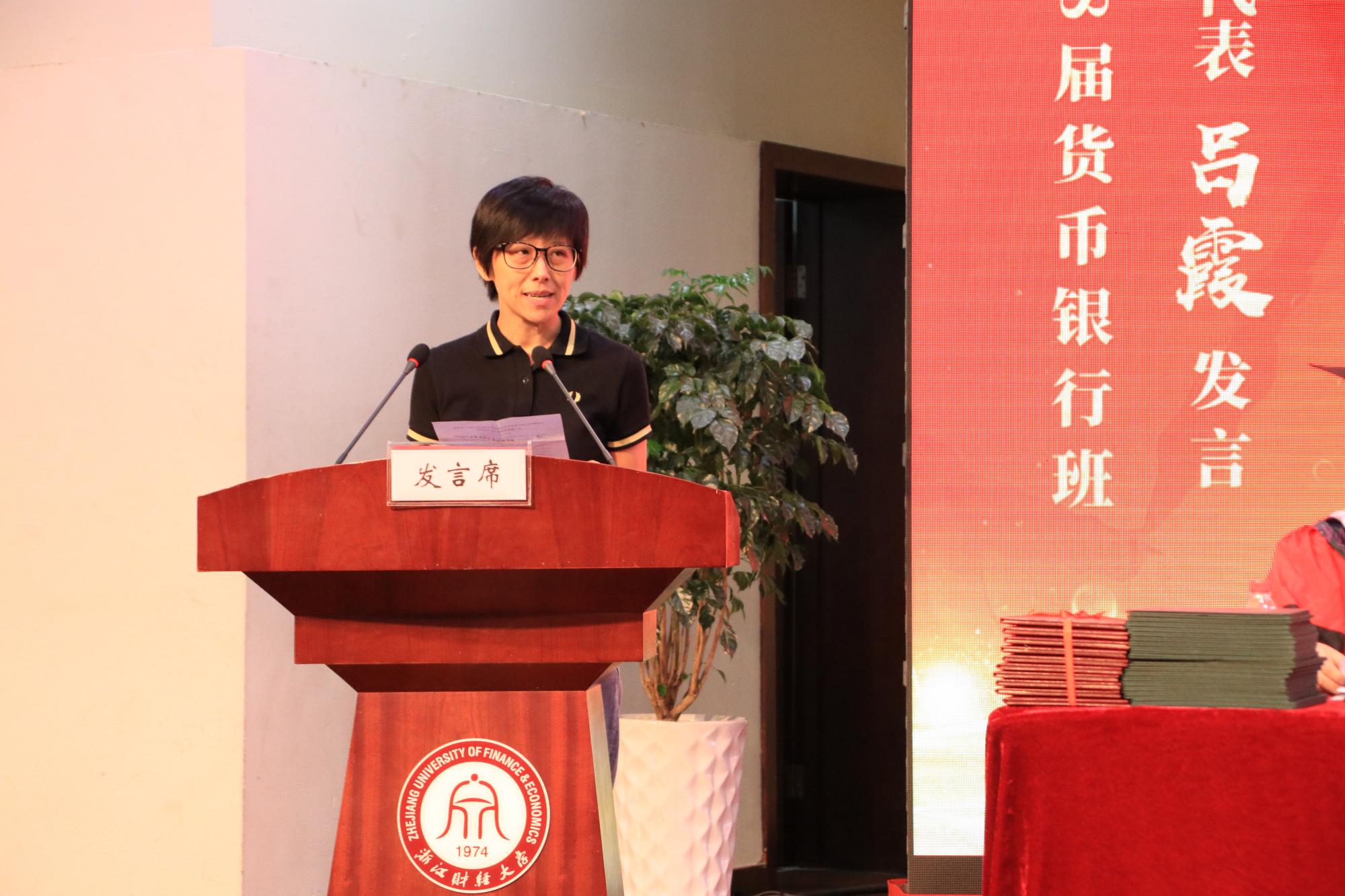 1998届货币银行班校友、关瑞慈善基金执行董事吕霞结合自己的人生感悟表达了对母校的感恩之情,介绍了“明栋基金”设立的初衷及举行的相关活动,衷心地希望毕业生们能以“敢于担当、善于协作、勇于创新”的姿态踏入各个新领域,展现“浙财人”的风貌。