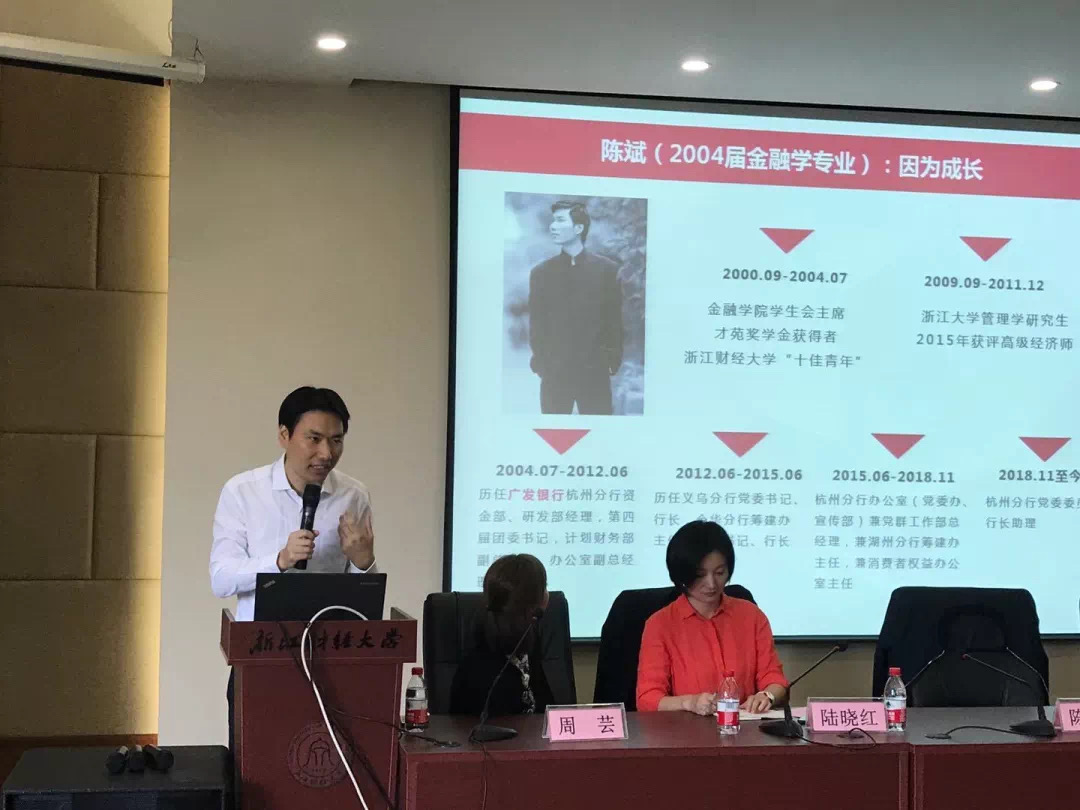 学生会主席的他,现已是广发银行杭州分行党委委员和行长助理。如今功成名就的他重回母校,以“因为成长”为主题,分别从一个“过来人”的经历及经验,一个“银行人”多认知和思考,一个“旧青年”的感受和体会三方面发表了他自己的感想。第一方面中,他就大学迷茫期如何调整心态为学弟学妹提出了宝贵的建议;第二方面,他谈了银行业的新发展趋势;第三方面则涉及了职场,其中个人的态度和价值观是起决定性作用的。如此满满的干货,必将对同学们的未来起到良好的导向作用。