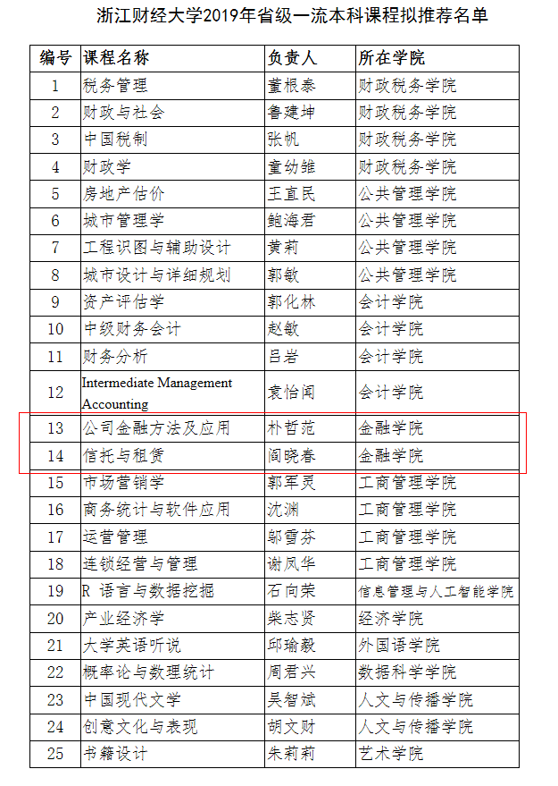 朴哲范老师的《公司金融方法及应用》和阎晓春老师的《信托与租赁》获2019年省级一流本科课程立项推荐。