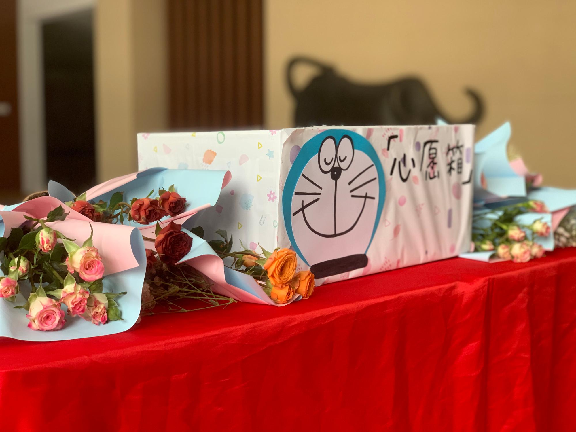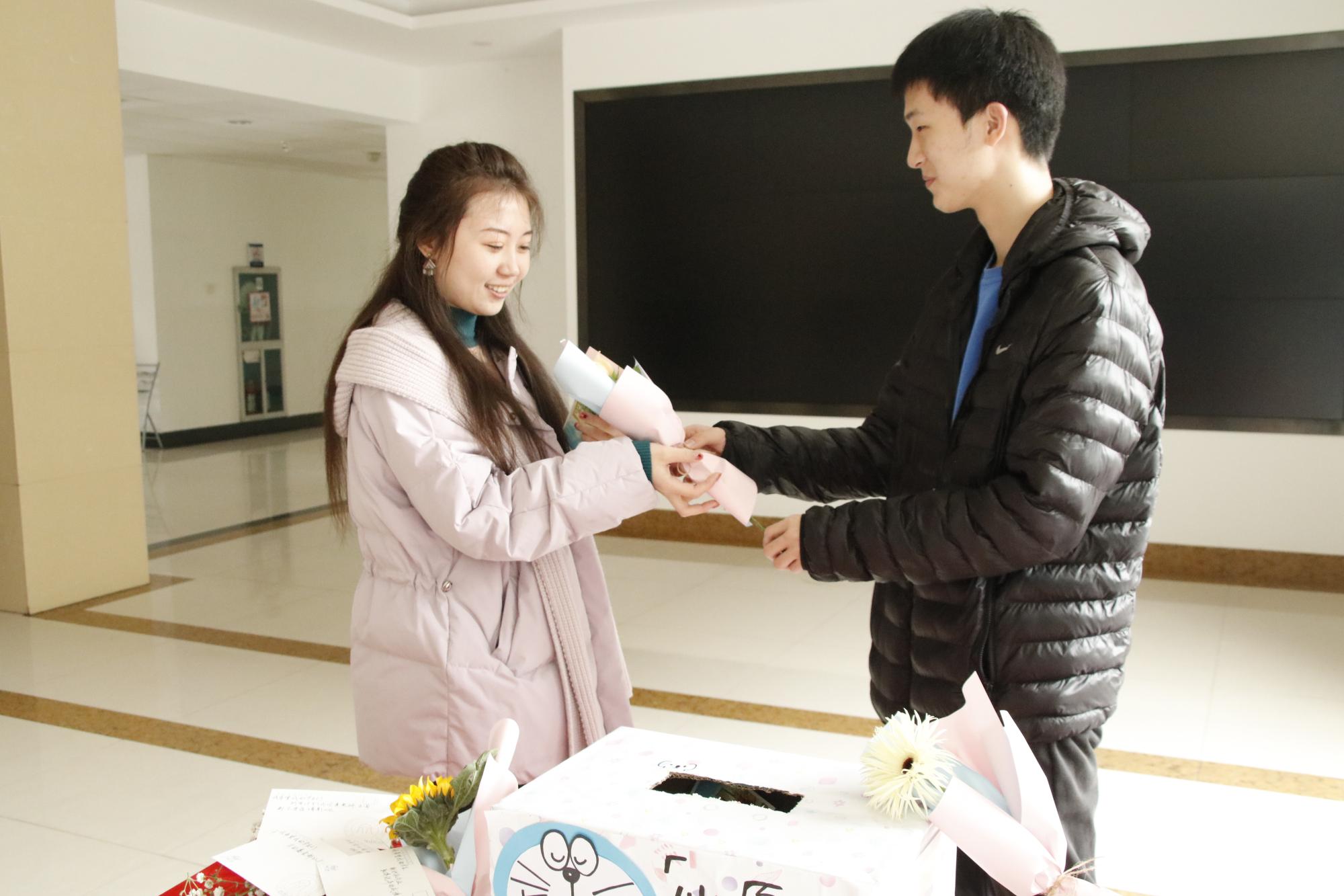 楼前欢声笑语,老师们在“心愿箱”中抽取的心愿卡,卡片上写着“希望我考研的孩子们都能顺利上岸”“我希望我的学生积极上进,取得优异成绩”“我希望能够去电影院看一场电影”等心愿。而心愿卡上的内容,则由同学们帮助老师完成,希望给老师们带来春日里的温暖与感动。随后,学生代表们一一为老师们献上鲜花,并合影留念。