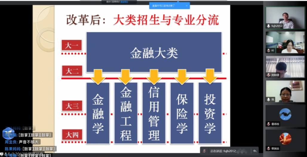 分管教学副院长傅俊辉介绍了学院人才培养方案和CFA项目。他向全体新生和家长介绍了改革后的大类招生与专业分流,详细介绍了四年学习生涯的课程规划与大类专业特色,强调了在校期间绩点的重要性,并从“终身学习意识”、“身体锻炼意识”、“职业底线意识”三个意识,特色鲜明地阐述了学院的培养角度及对同学们的期待。此外,傅院长还介绍了酷爱成人网