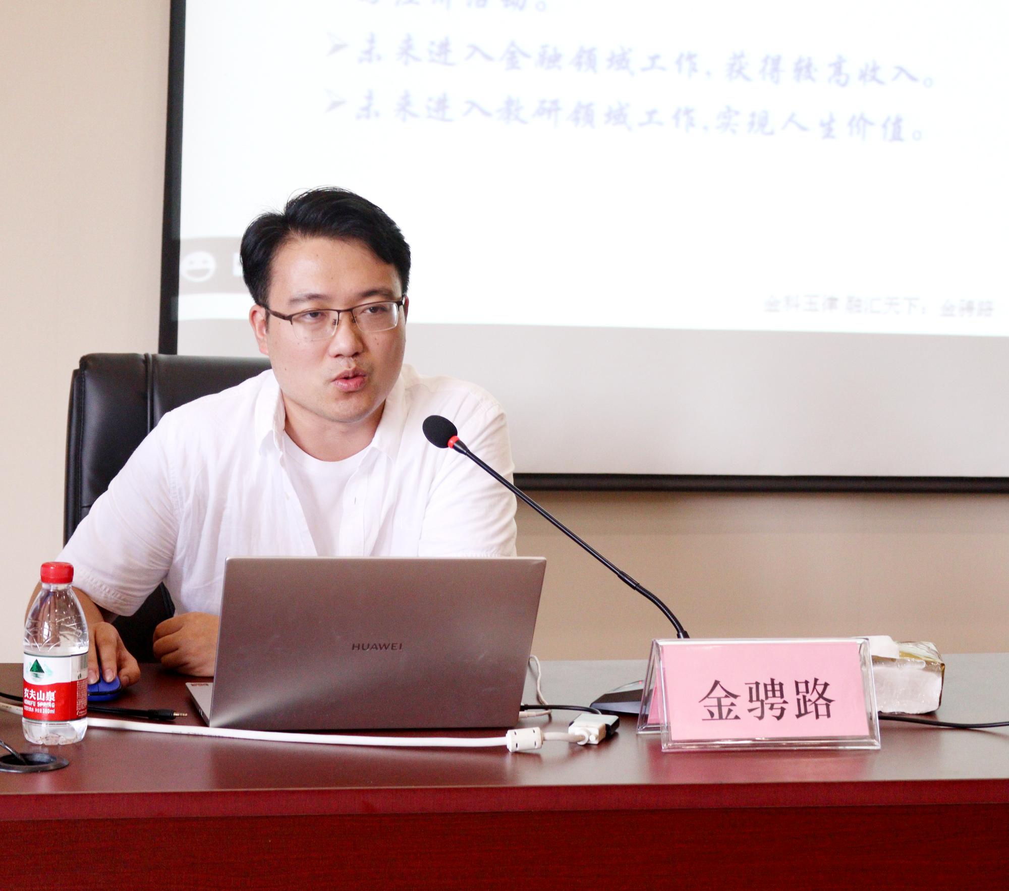 金融系主任金骋路老师以学院金融学专业的基本介绍开篇,指明金融学专业具有五项特色与优势,并细讲解了“金融学专业是什么”“金融学专业学什么”和“金融学专业怎么学”。金老师还展现了往届金融学子的案例风采,给出了就业和职业规划的建议,激励新生们努力学习,不断攀登。