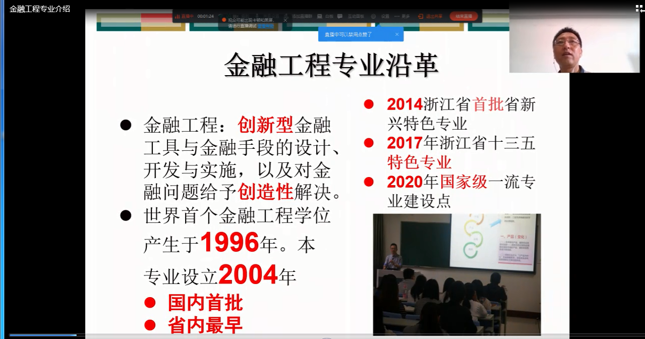 金融工程系主任钟立新老师为同学们讲解了金融工程专业的沿革过程,强调以创新、交叉、实践为中心的专业建设特色。钟老师指出,金融工程专业具有学科交叉、师资交叉和行业交叉的三维交叉特征,金融工程专业采用一体化实践教学体系,立足于培养创新、研究型人才。