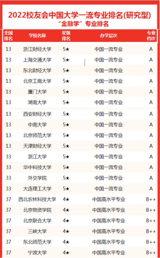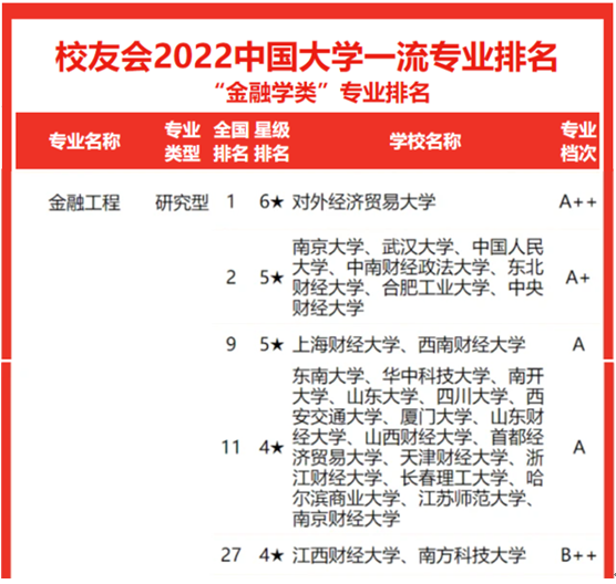 金融学专业和金融工程专业均进入全国排名前15,其中金融学专业为五星专业,全国排名第13,金融工程专业为四星专业,全国排名第11,且均为省内第一。