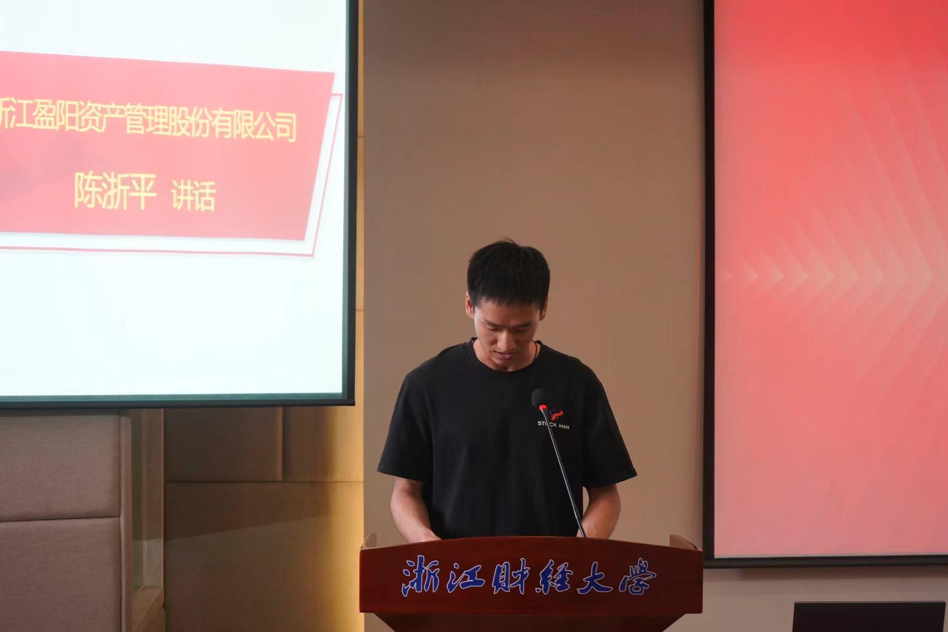 接着,浙江盈阳资产管理股份有限公司基金经理、16届校友陈浙平代表讲话。他提到,今年是“盈阳金融突出贡献奖”评审的第八年,在学院广大师生校友的共同努力下,学院的教学质量不断提高、科研与社会服务建设不断提升、学科专业建设不断突破、育人成果成效显著。他感恩铭记老师的谆谆教诲,衷心祝愿学院和学校越办越好,能够为社会输送更多专业性金融人才。