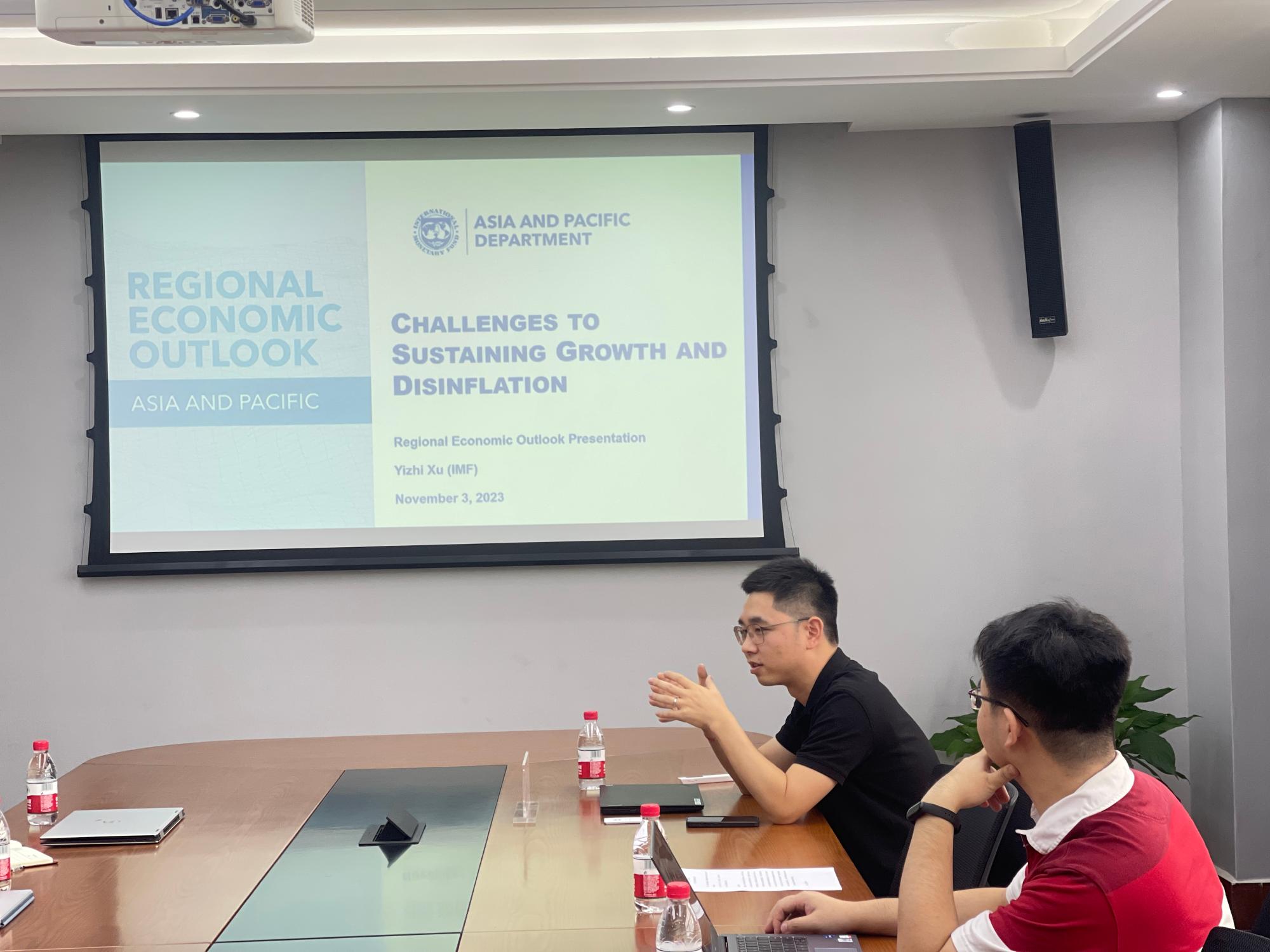徐绎之博士首先简要介绍了自己的主要经历及研究领域,之后分别从亚太经济展望及相关风险、中国在展望变局中的重要角色以及国际货币基金组织对亚太各国的政策建议等三个方面进行介绍。他指出,亚洲今年仍将贡献约三分之二的全球增长,但经济增长动能可能正在减弱。多数国家通胀趋于缓和,预计将在2024年回落至央行的目标区间。发达经济体和新兴市场国家金融条件渐趋分化。中国对周边国家的经济溢出效应日趋明显。国际货币基金组织建议亚太各国实施从紧的货币政策应对通胀压力,增强财政纪律,强化宏观审慎政策以应对长期利率上行带来的金融脆弱性,不断推进结构性改革。在互动环节,参会老师和同学积极和徐绎之博士进行了沟通交流,讲座在浓厚的学术讨论氛围中结束。