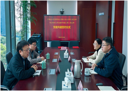 教工第三党支部与中国出口信用保险公司浙江公司第二支部在中国出口信用保险公司浙江公司举行了党建共建签字仪式。双方支部书记共同签署了党建共建协议书,标志着双方正式开启党建合作新篇章。