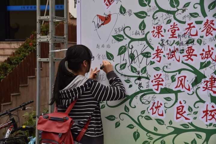 院学生会各部门成员第一时间出现在了活动现场,率先在“诚信之树”上签字,为学风建设起到了良好的带头作用。同时,活动也得到了同学们的热烈支持与积极响应。在长达三小时的活动时间里,同学们都陆续赶到学院楼前,在签名板上郑重地签下了自己的名字。他们纷纷表示每一个同学应自觉投入到“正风行动”中,为建设学风新貌贡献出自己的一份力量。其中,部分同学特意骑车来到学院楼前签下了自己的名字。他们以实际行动表示了对“正风行动”的积极支持。此外,本次活动分为线上线下两个部分,在学院公众平台上,同学们积极参与评论,受到了广大同学的热烈响应。