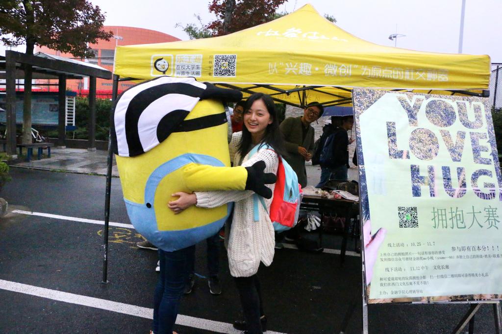 此次活动分为线上和线下进行,线上活动参与者自行发送拥抱主题照片,与线下拥抱所拍的照片一同评奖。当天中午虽然下着雨,天气寒冷,同学们仍热情不减,纷纷与穿着小黄人玩偶服的拥抱大使相拥拍照,甚至连外国同学也热情拥抱了小黄人,大喊“Do you feel my love?”。现场洋溢着浓浓的温情,笑声不断,参与活动的每一位同学都获得了由主办方提供的小礼品。