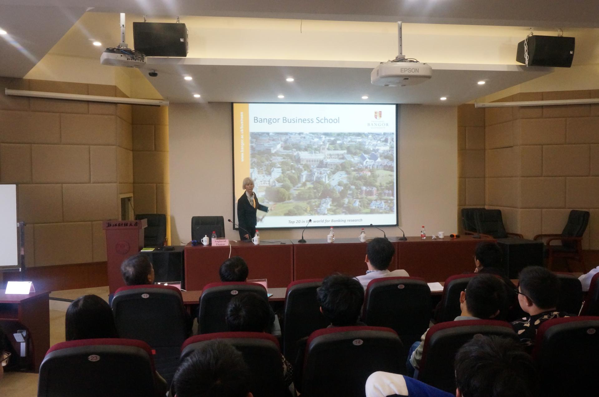 托马斯主任着重介绍了英国班戈大学是一所历史悠久,商科突出的高等院校,简要介绍了班戈丰富多彩的课余活动和严谨的教学方式。讲座现场,同学们用流利的英文询问了有关班戈大学课外活动、课程设置、CAF考试等问题,她一一做了详细回答,并对我校学生的语言能力和专业素养十分满意,非常欢迎中英金融班学生到班戈就读。她表示会最大限度照顾同学们的学习生活,帮助中国学生尽快适应英国学习。