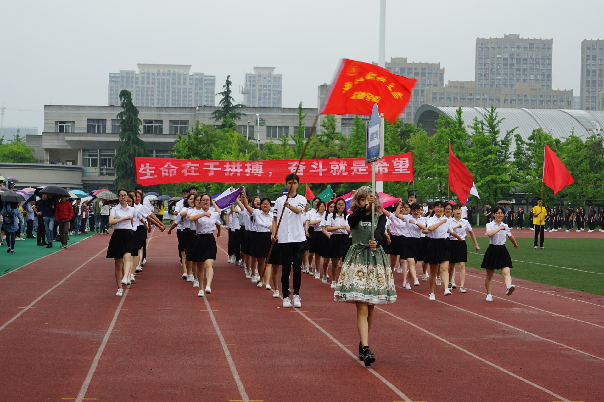 运动员方阵依然精神抖擞,迈着整齐的步伐喊着响亮的口号入场,他们用铿锵的步履展现了金融学子积极进取的风貌。