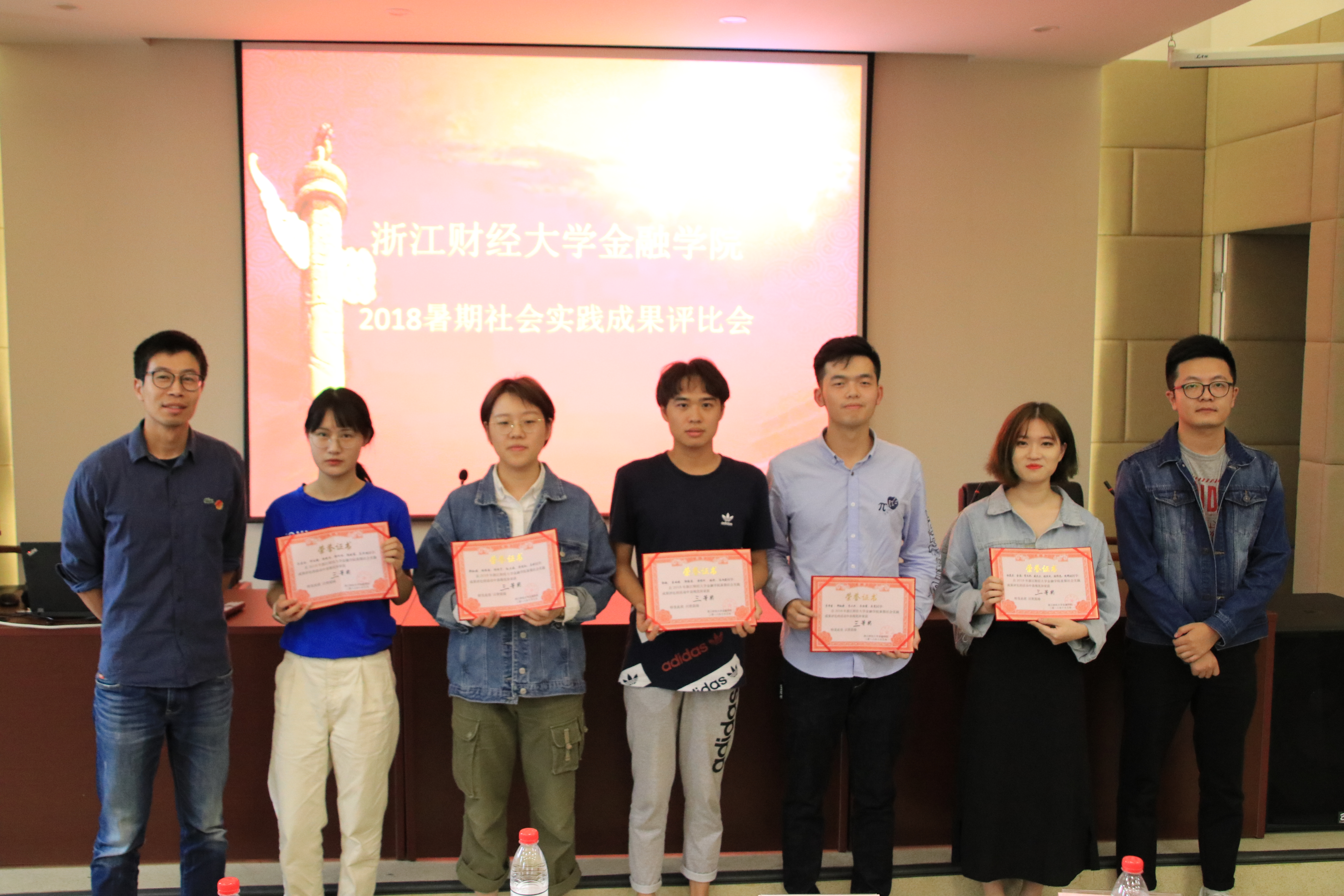 2018年暑期社会实践评比会在学院楼202会议室举行。会议由学院团委书记蒋超主持,学院党委副书记叶秀,辅导员翟丽媛、聂亚平、沈耀杰出席会议并担任评委。