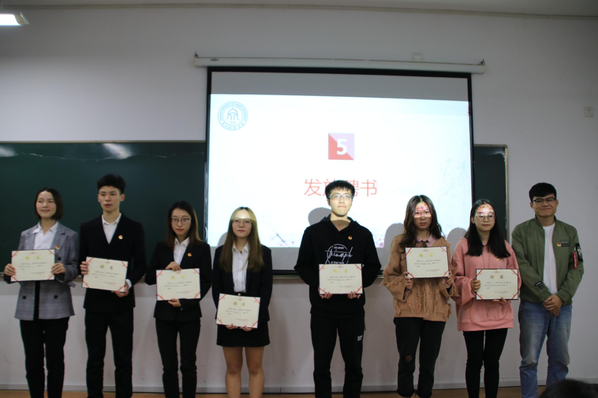 蒋超老师首先致辞,他全面介绍了学生会的发展历程、整体概况和工作内容,强调作为学生会一份子所独有的荣誉和归属感,并代表学生会向新成员表示热烈的欢迎。随后,学生会主席叶晓军分享了自己在学生会工作的经历与收获,并祝愿学生会全体干事都能在这个大家庭里有所成长,有所收获。学生会部长代表钱蕴、干事代表黎瑞阳轮流发言,分享了自己的工作经历、感悟和目标。大会最后,蒋超老师为主席团和部长副部颁发了聘书并学院楼门口合影留念,记录这宝贵的一刻。