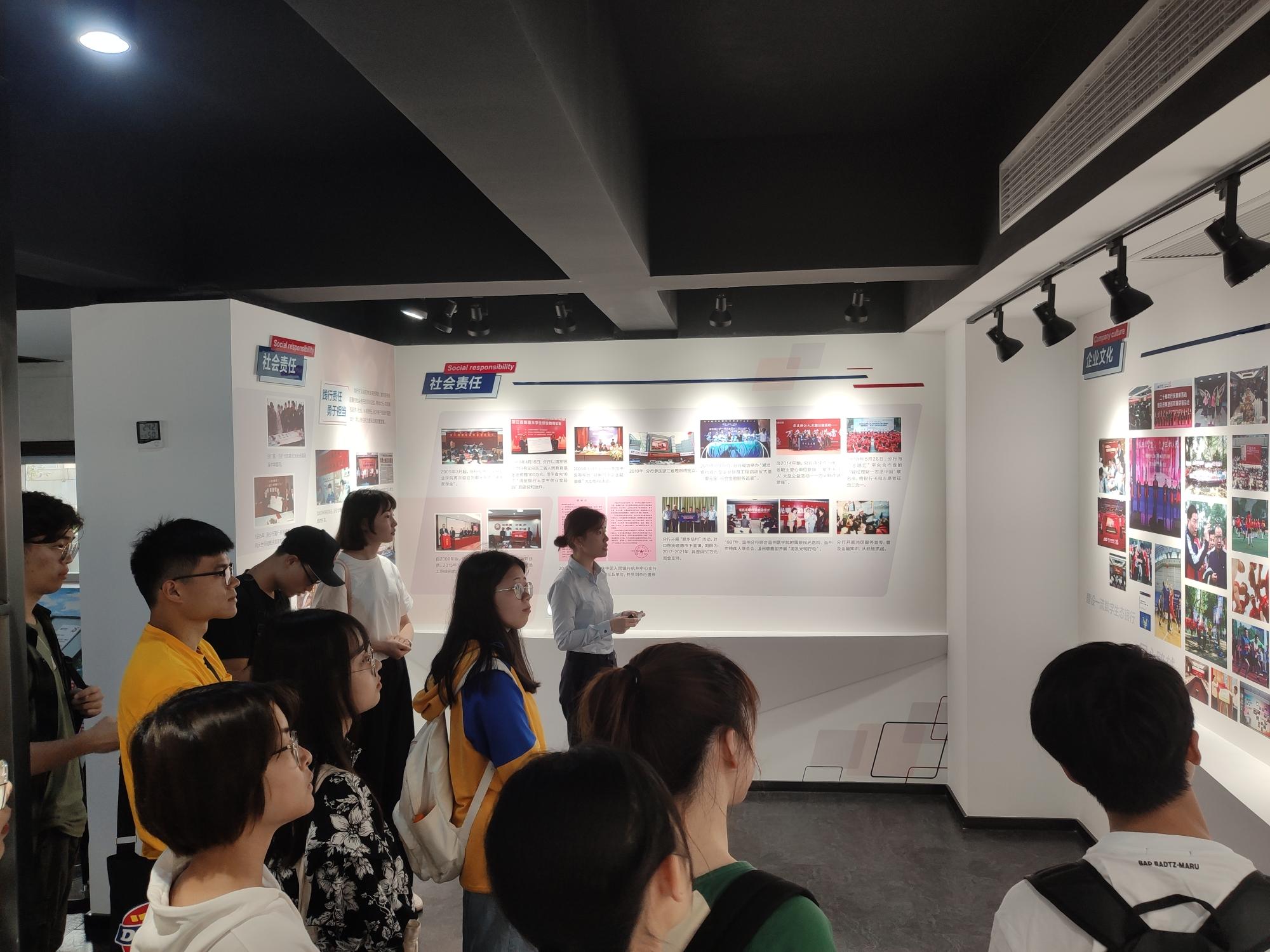 浦发银行理财经理刘安妮先带领同学们参观了浦发银行杭州分行行史馆,介绍了企业的发展历史、党建工作、社会责任及酷爱成人网等相关内容。