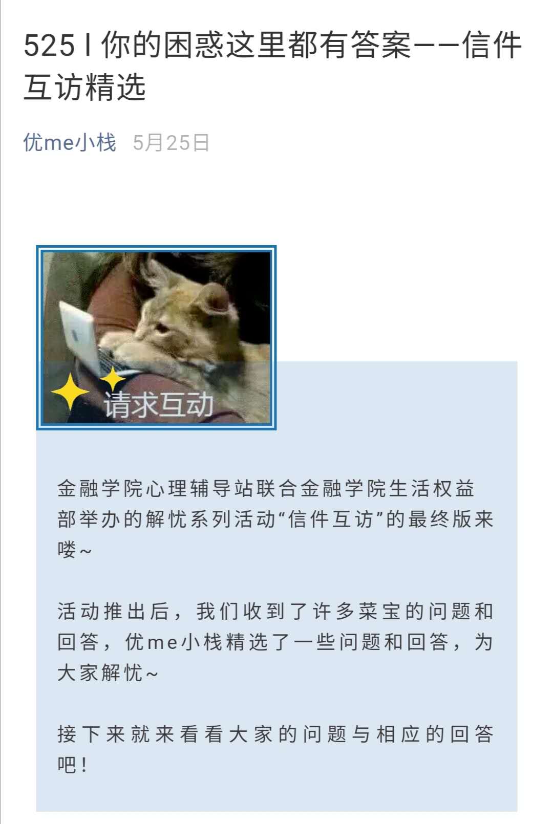生活权益部举办了线上信件互访活动,替人解惑,为己排忧。活动中,同学们将自己的烦恼邮件投到小栈指定邮箱,等待他人解答。投稿人也会收到小栈反馈的邮件,需要帮助他人答疑。答疑邮件由小栈转回给投稿人。针对信件中典型的代表性问题,由优me小栈心理委员统一解答,并在微信公众号展示。活动共收到来信86封,发回信件86封。“有信必回”的原则使每个同学都收到了安慰支持或意见回复。尽管是来自“陌生人”的宽慰与解答,同学们却表示还是很感动,也收获了很多不一样的观点和想法。