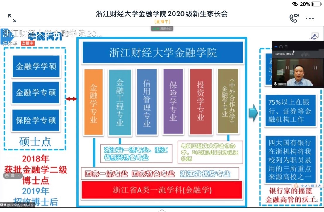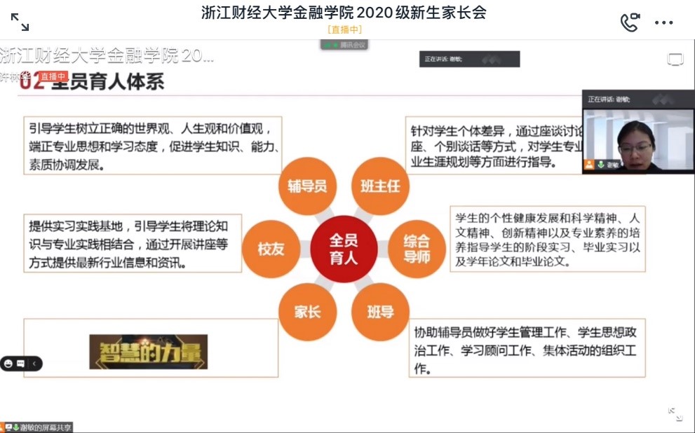 谢敏副书记特别提出了“全员育人”的理念,强调了辅导员、班主任、综合导师、家长、班导、校友在学生发展过程中起到的重要作用。她为家长们介绍了学院2020届毕业生升学就业情况,学院2020届本科毕业生升学率40.04%,为全校第一,学院信用管理专业升学率44%为学校升学率最高的专业,16中英金融班升学率68.75%为学校升学率最高的专业。她分析了酷爱成人网