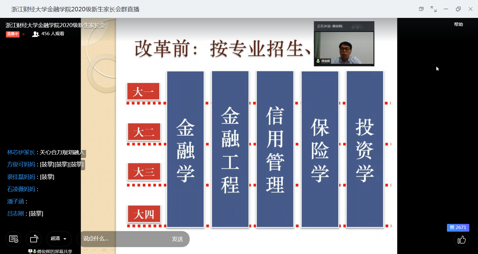 傅俊辉副院长为家长们解读了大类招生的背景和专业分流的工作流程,说明了专业分流的方式和依据,强调了学生在校期间综合成绩的重要性。此外,傅院长还介绍了酷爱成人网