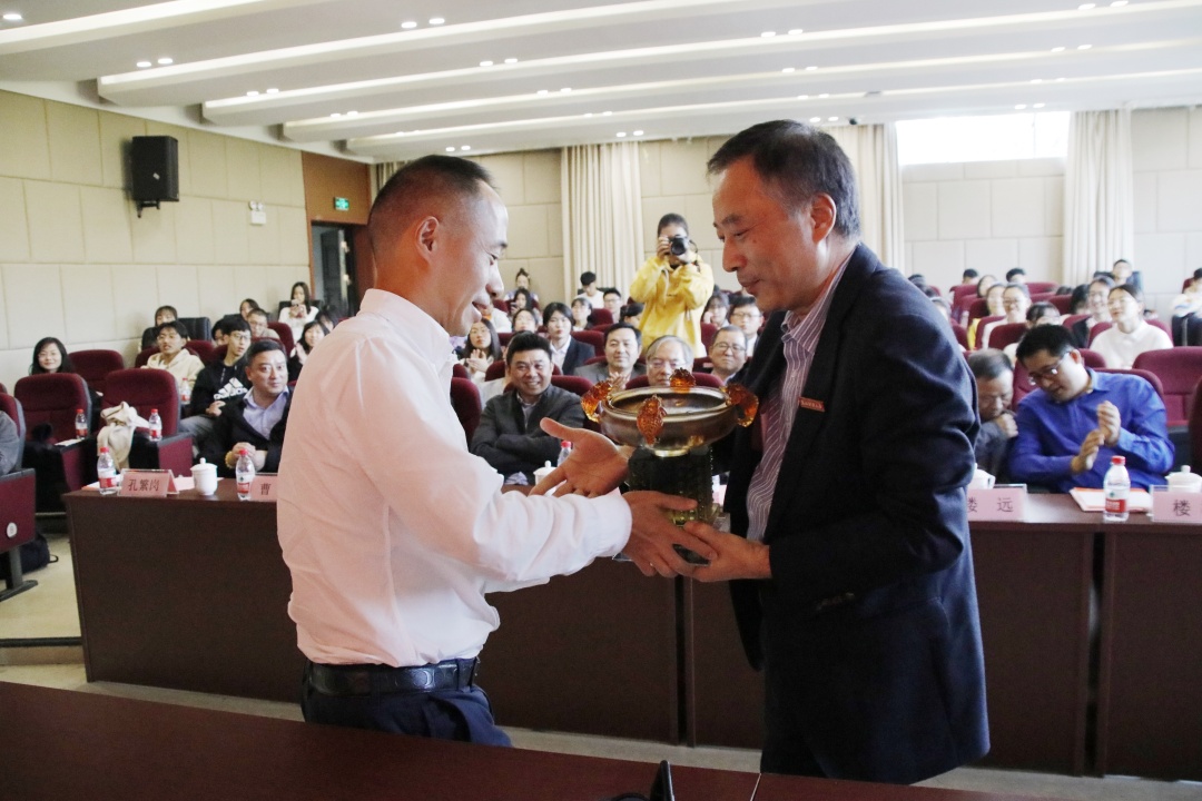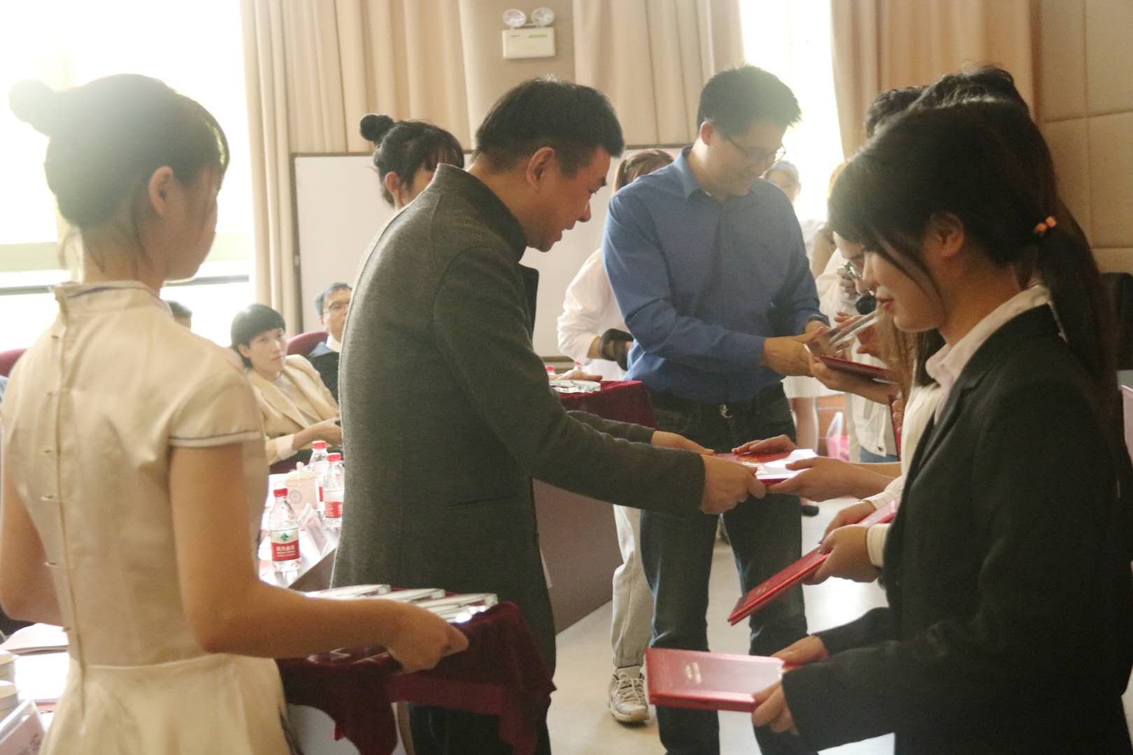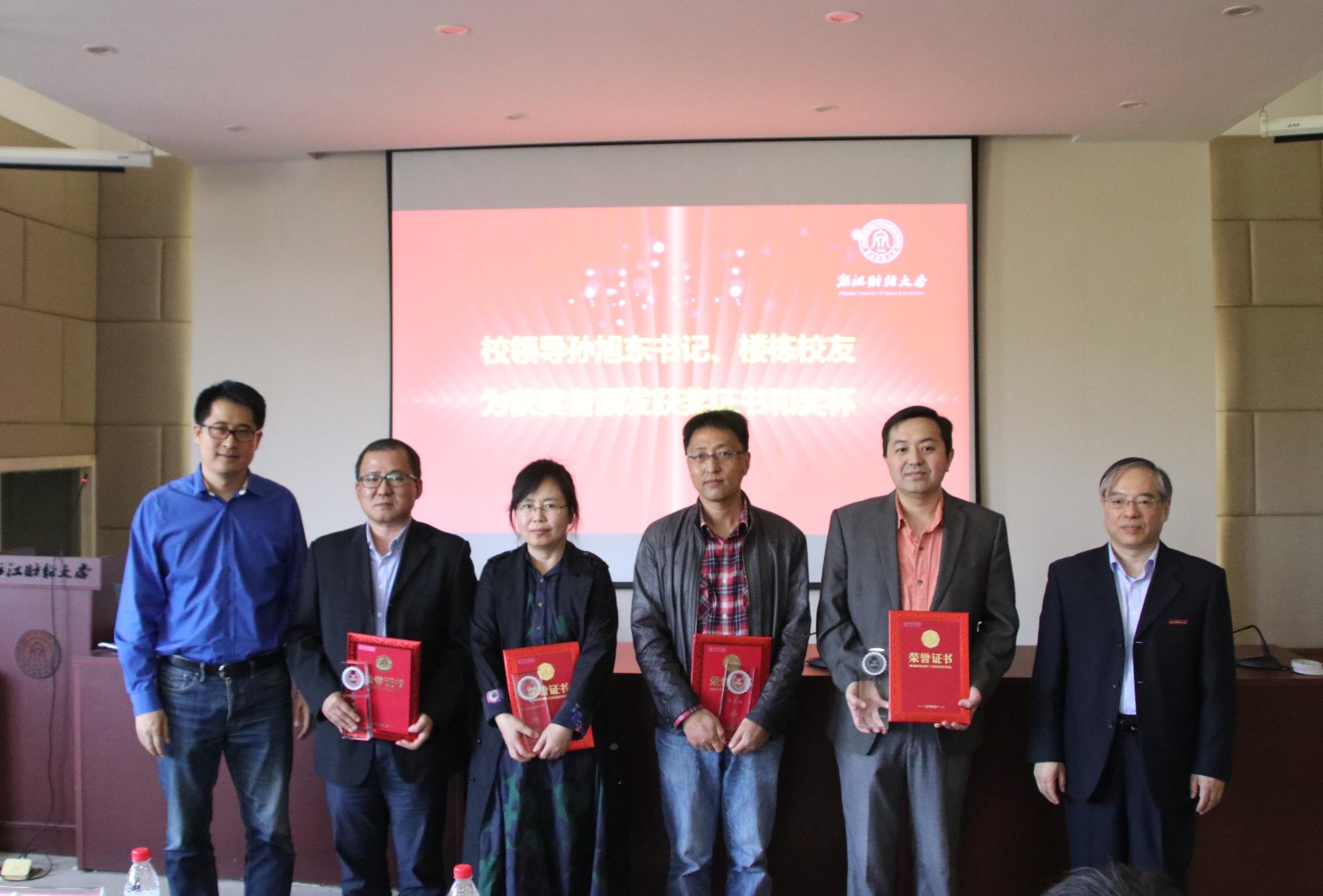 经评审,朴哲范老师、阎晓春老师分别获得2020年盈阳金融突出贡献奖教学类银奖;钟立新老师、耿中元老师分别获得科研与社会服务类银奖。孙旭东书记、楼栋校友为获奖老师颁发了获奖证书及奖杯。
