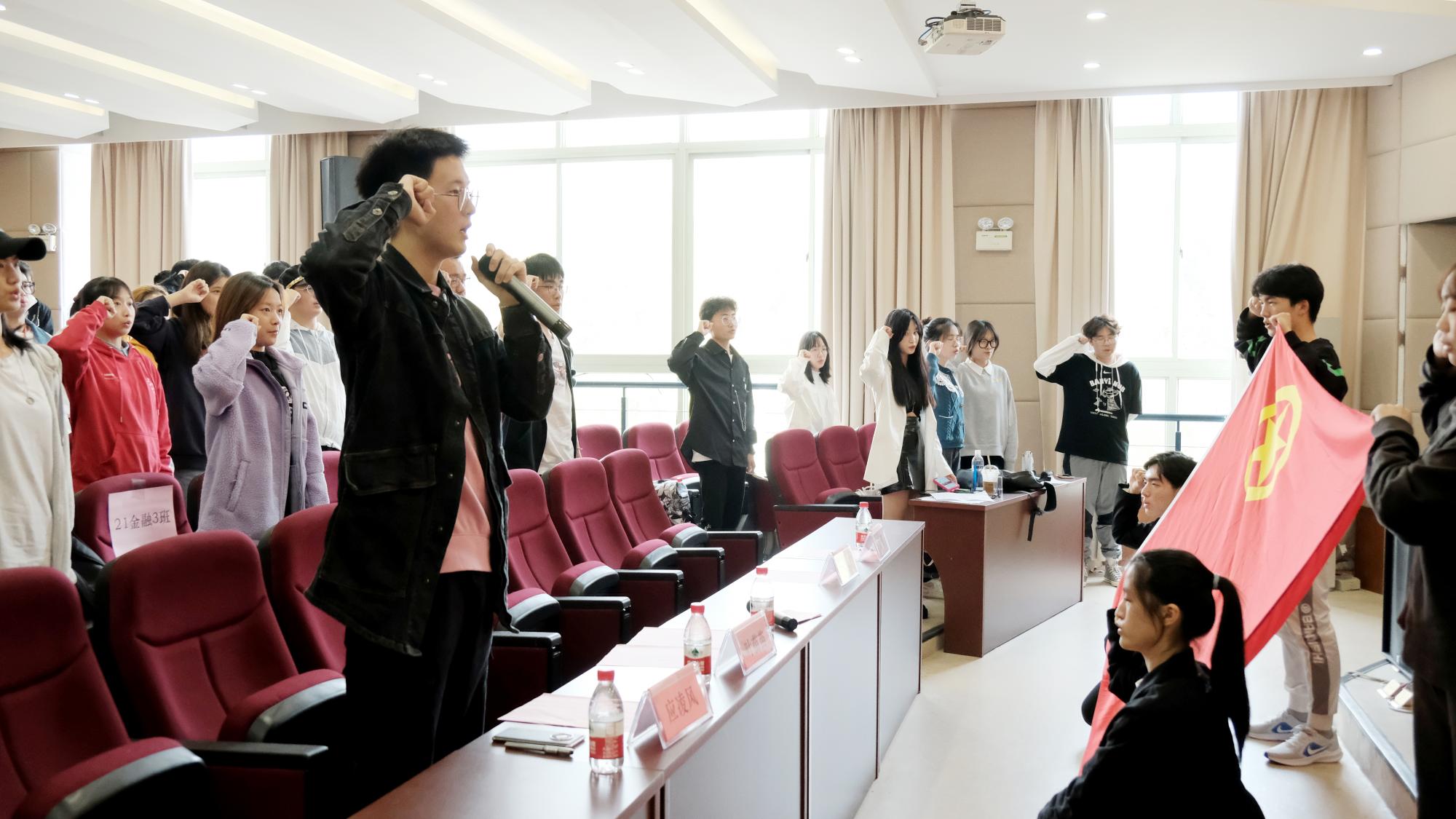 会议最后,全体参会人员面向团旗,高举右拳,重温入团誓词,重新感受初为团员庄严宣誓时的光荣和喜悦,不忘初心,继续前进!