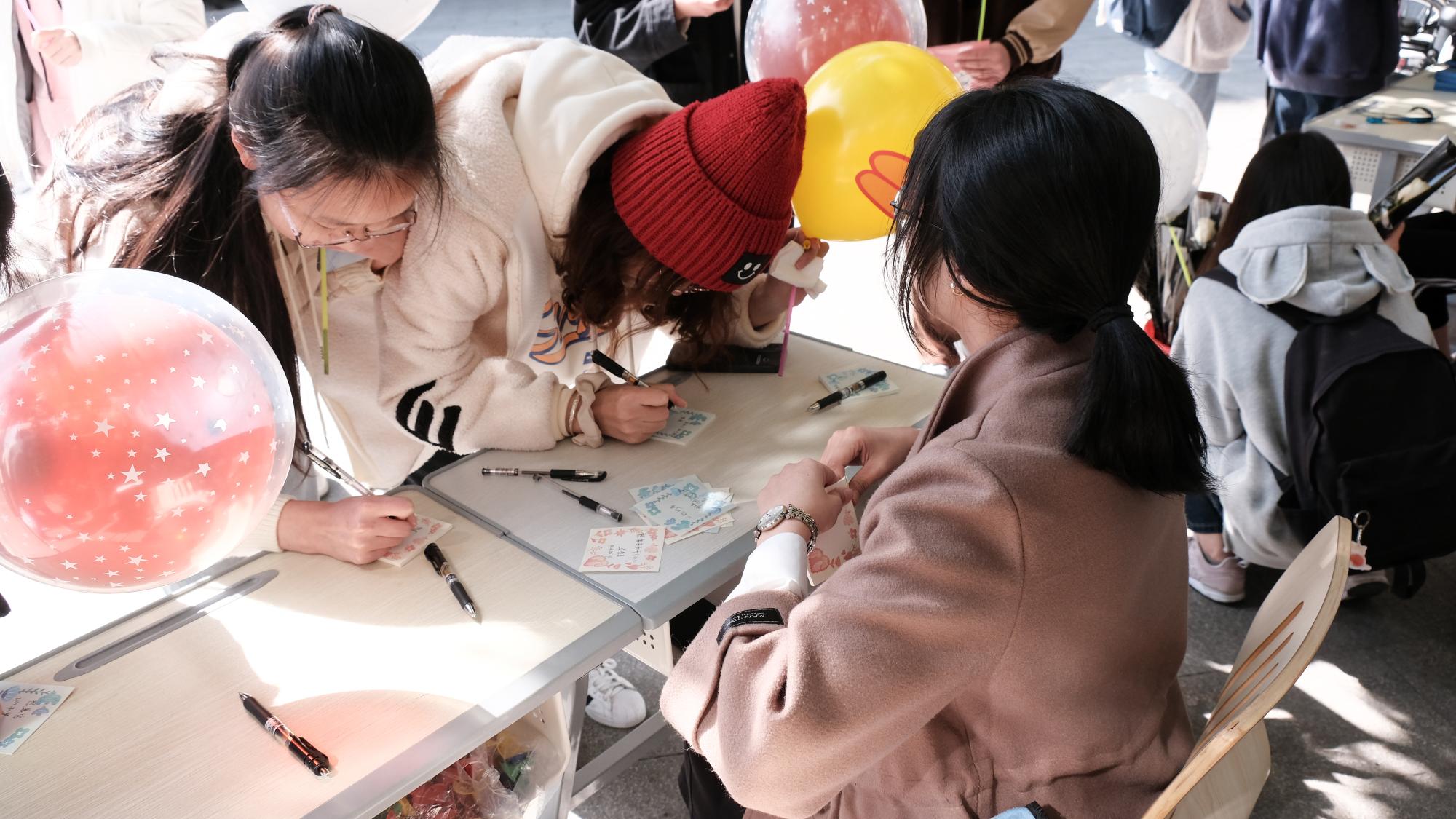 在“浪漫彩球”环节,学院为女生们准备了不同颜色的气球。按照活动规则,她们找寻拥有其他颜色气球的小伙伴们进行组队。成功集齐三色气球的“小联盟”成员们,每人都可得到一份精美的小礼品。礼品丰富,包括纪念胸针、纪念书签、多样便利贴等。参与活动的女生们表示不仅收获了春日里的温暖和美好,也增进了彼此的友谊。
