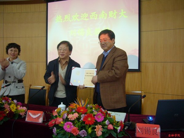 院长虞群娥教授等嘉宾出席了本次讲座。钟晓敏副校长向刘锡良教授颁发浙江财经学院教师聘书,并对刘教授前来讲学表示热烈欢迎。