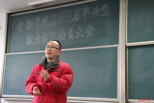 陈伟老师首先向同学们做了就业实习的思想动员。他告诫同学们切莫眼高手低,轻视某些具有发展潜力的工作岗位,从而错失许多良机。今年银行提供的就业岗位仅为去年的一半,并且有更多的研究生、出国留学生参与到激烈的竞争中,就业形势不容乐观。但是陈伟老师还是鼓励大家以积极的心态去面对挑战,尽自己最大的努力迎接未来。