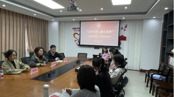 在学院楼党员之家召开“金生有约 融心筑梦”--学风建设师生座谈会。学院学生工作办公室辅导员,与来自各年级的学生代表进行了深入交流。