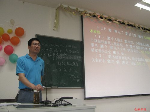课堂上,杨书记根据组织原则,党的纪律和党的作风建设三大方面介绍了党的组成和发展。他强调,民主集中制是党的根本组织原则,以民主集中制的意义和作用证明了它是科学的,合理的。然后,他又谈了党的纪律和内容,并且恳切地希望同学们要努力做遵守纪律的典范。最后,杨书记对党的作风建设作了详细的介绍并肯定了其建设的重要性。