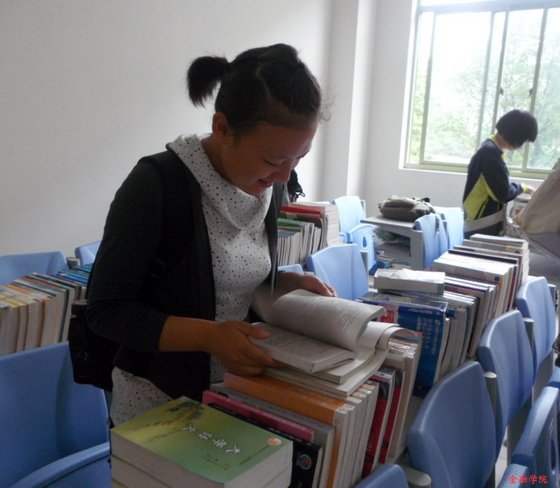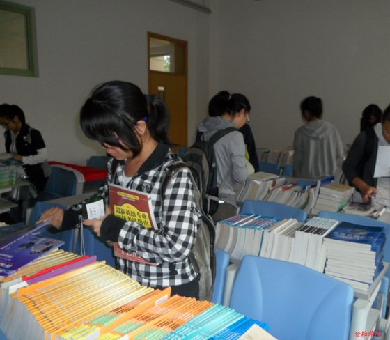 一入学院楼大门,书香银行那鲜艳的海报率先映入眼帘,两位工作人员热情地向同学们介绍书香银行的借贷规则。在书香银行的借贷教室里,同学们提供的旧书都被分门别类地整理好,码放整齐供同学们借取。