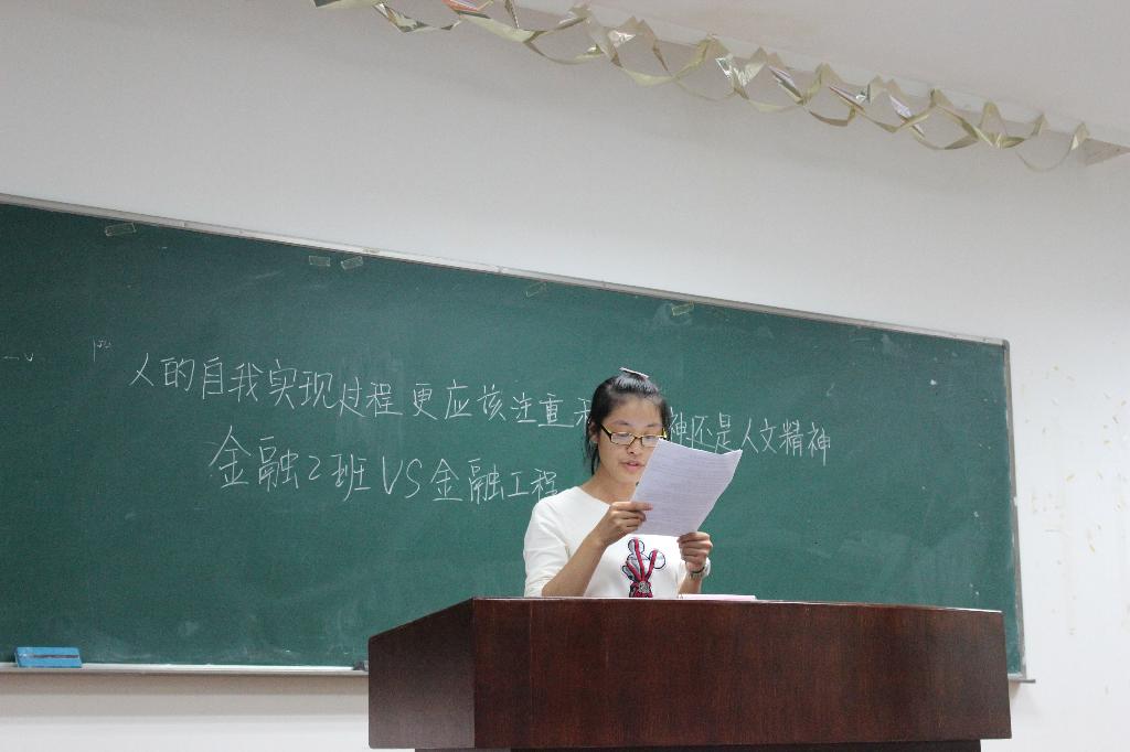 13级新生辩论赛在学院楼202室正式“开战”。本次比赛的正方为金融工程班的辩论队,反方则是金融2班的辩论队。双方就“人的自我实现过程更应该注重科学精神还是人文精神”这一辩题展开了激烈辩论。
