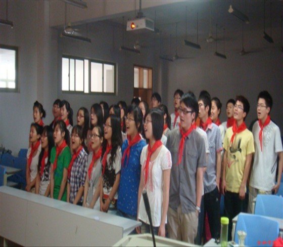 第二环节的“红歌颂”,同学们不仅展现了其精湛的歌艺,也尽显了其超强的歌词记忆力。铿锵有力的歌词,昂扬激越的歌声,乘着红歌的翅膀,团员们重新回顾了建党90周年走过的峥嵘岁月。