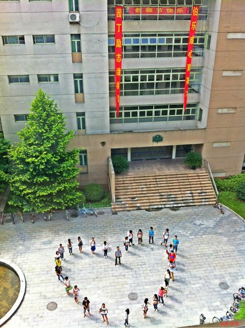 学生齐聚学院楼下,为老师们献上教师节的第一份礼物。