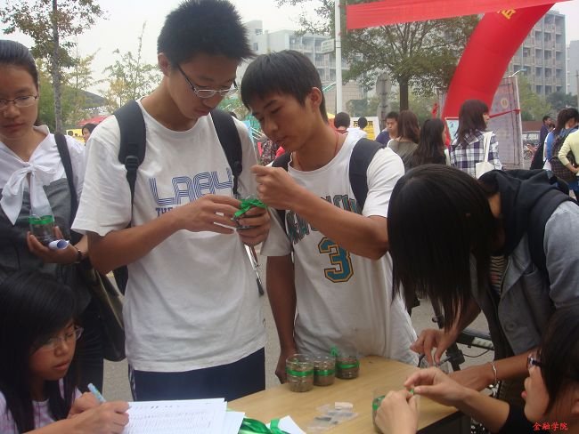 在活动现场,只要填写一份领取花种登记表,就能拿到一个简易的手工小花盆,这都是生活部的干事们用运动会后收集到的空矿泉水瓶剪成的。填上土,埋下种子,绑上绿丝带,一盆盆小巧可爱的盆栽就可以被登记人领走栽种了。干事们还会细心讲解注意事项,许多同学都表达了对栽种的热情,纷纷进行登记,将盆栽“领养”回寝室,种下对财院的祝福。