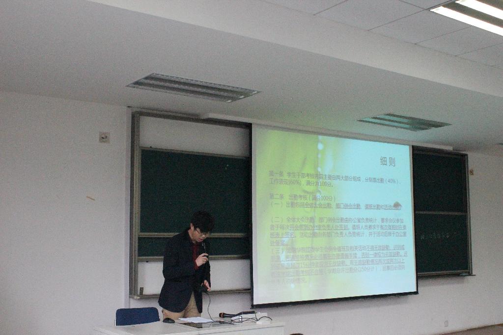 会议主要分为三个部分。首先由组织部副部长尉澎波为大家讲解学生干部的考核内容,内容又主要包括了两个方面:出勤考核以及工作表现。尉澎波又结合PPT和口头描述形象地向大家展示了出勤的七个方面和表现的具体内容,在场的同学们对考核要求也有了更明确的认识。