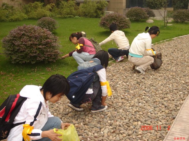 大一的新生分头行动,在每个角落,我们总能发现一个个弯腰的身影,他们脸上的笑容是劳动的喜悦,是奉献的快乐!有人驻足道:“黄丝带又在行动了!”现在,当我们走在校园里,你是否也会感慨那么清洁的校园,那么优越的学习环境呢?让我们一起美化我们的校园!