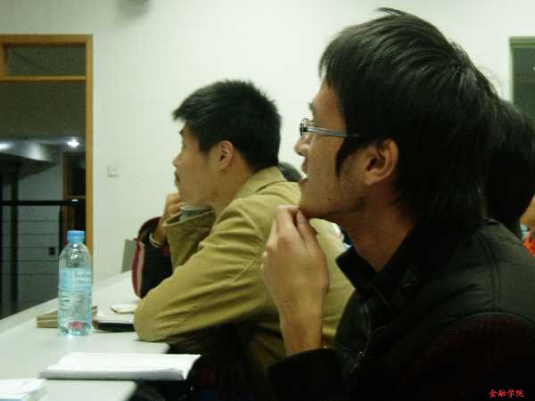 交流使得几百人的教室座无虚席。作为上届模拟证券投资竞赛的冠军得主,他为大家传授了他在证券实盘道路上的经验。他分析了未来的大盘走势,透视震荡股市格局中的风险所在,为我们指出了一条在股市里险中求胜的光明大道。