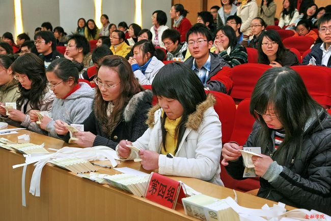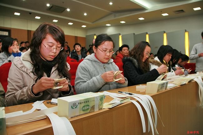 大三男生小陈从桌上拿起一刀练功券,娴熟地拆捆、执钞,左手将钞票从桌面上擦过,拇指顺势将钞票向上翻成微开的扇形,右手大拇指和食指轻轻捻动,“钱”就一张张有节奏的弹下,整套动作一气呵成。和会场上其他忙着点钞的同学一样,他正在为马上就要举行的点钞大赛做着最后的准备练习。随着比赛计时开始,参赛的十组选手迅速进入状态,有条不紊地开始清点面前的练功券。有的选手嘴唇微微颤抖,默记张数,有的选手则得心应手地拆捆、清点、扎捆,然后记下每刀距离100张的增减数。五分钟后,评委根据每组的速度和准确率评分,金融2队以人均六刀六百张,准确率100%的成绩获得冠军。