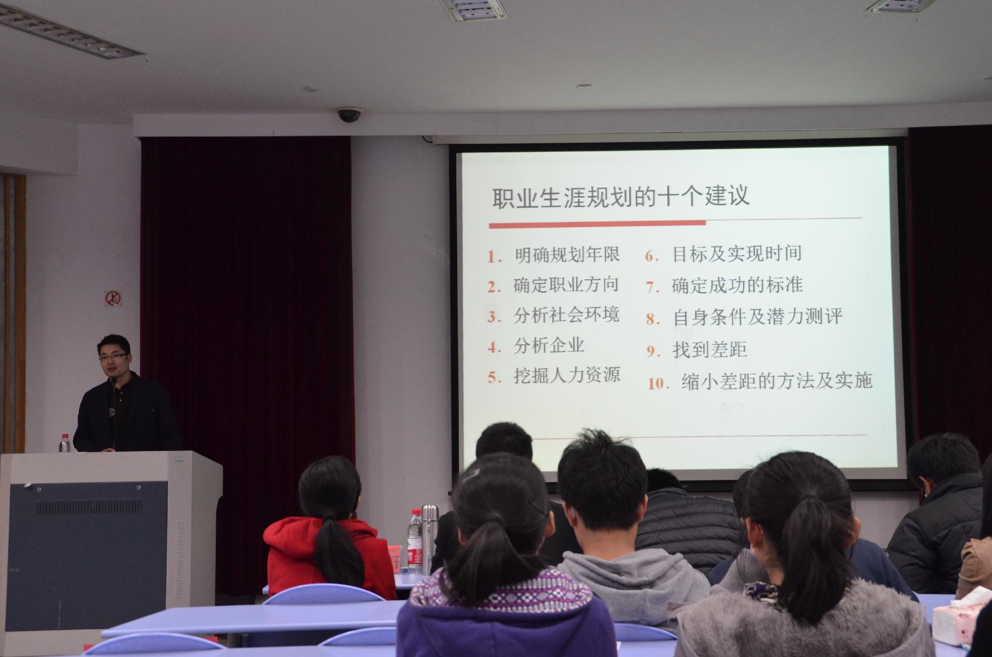团课刚开始,沈老师就饶有兴趣地调查了现场的同学对于自己未来职业设想的情况,在座同学都认真回想了自己曾经对于人生的一些规划,并且都积极地与老师配合。现场气氛立即活跃起来,在一片欢笑声过后,同学们都在笔记本上留下了自己的目标。之后,沈老师形象地用了5个“W”阐述了职业生涯中可能出现的问题。“What”,首先要了解自己将来的从业道路和方向;“Who”,其次是认识自己,明白自身的长处和短处;“Where”,应该在哪些点充分发挥自己的优势;“Why”,清楚自己为什么要走这条路;“How”,如何在新的起点上为当初定下的目标而做些切实的努力。与此同时,沈老师还讲了有趣的青蛙实验,告诫我们危险总是在你不经意间把你摧毁,反而是那些明显的挫折能让你奋进。最后,沈老师在一段激励的话语中结束了本次团课。热烈的掌声足以说明同学们的收获不小。