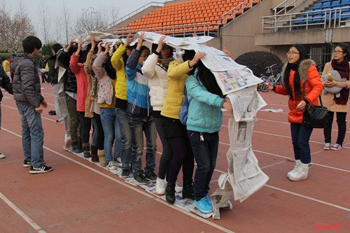 第四轮的活动中,十个人一起用报纸和胶带做成一个个圆环,在串联起来的报纸环里行走。这个环节大大考验了大家的动手能力、合作能力与配合意识。趣味运动会在开心愉悦的气氛结束,经过四轮激烈又欢乐的比赛,文艺部和学术部的组合以默契的配合获得了冠军。