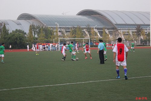 11号王哲奇在对方底线突然起脚,足球画出了一道完美的弧线,如同一道彩虹划过天空,惊艳全场。“球进了,球进了!金融领先了!”。场上沸腾了,欢呼雀跃的金融同学把每一寸绿荫都溢满了欢乐的气息。中场休息,双方队员都大汗淋漓,但没有一个人说累,双方队长都充分利用这短短的十几分钟的休息时间进行战术安排和人员调整,尽全力打好下半场的比赛。