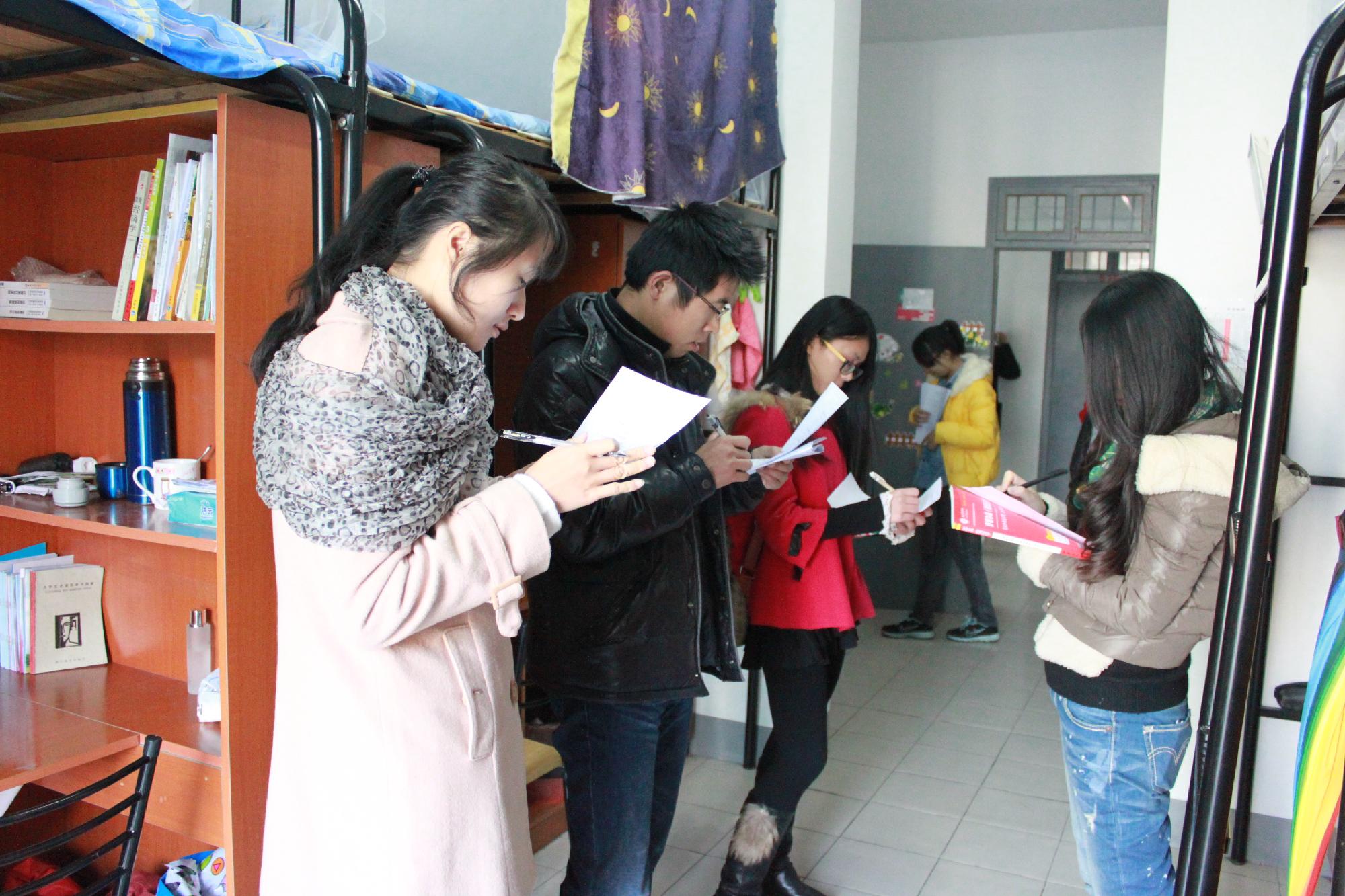 办公室主任陈炜老师、政治辅导员尹怀玉老师、吴轶韵老师、蒋超老师和学生会主要负责人组成的评选团走访了入围的25个寝室,并进行最终打分。