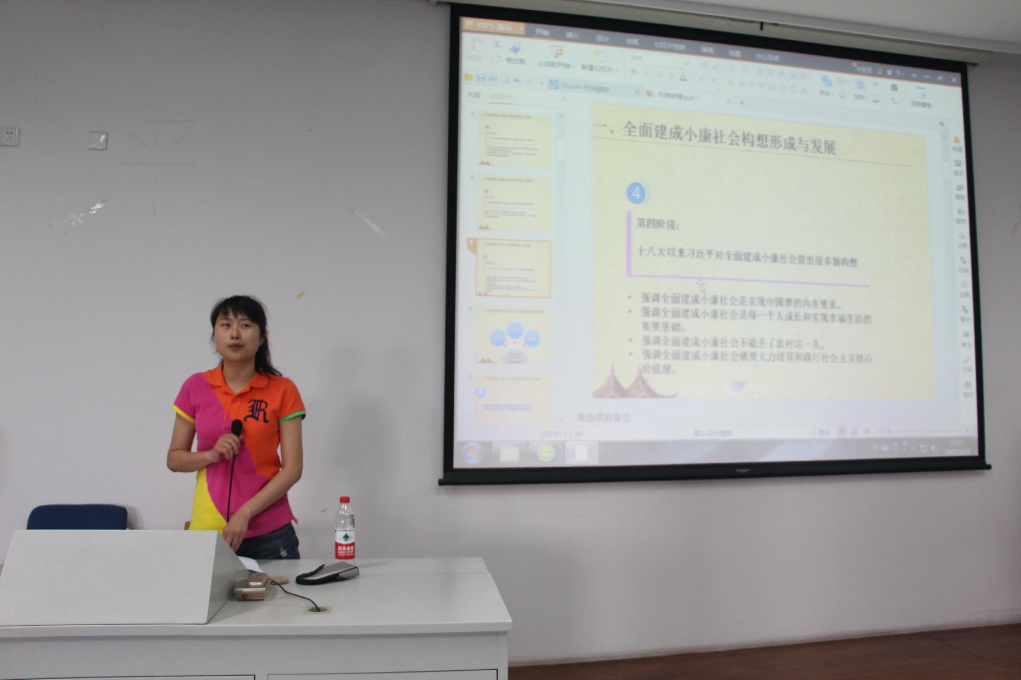 辅导员吴轶韵老师担任本次形势政策课的主讲人。本次授课题目为“深入学习习近平总书记的十八大讲话,全面建成小康社会”。